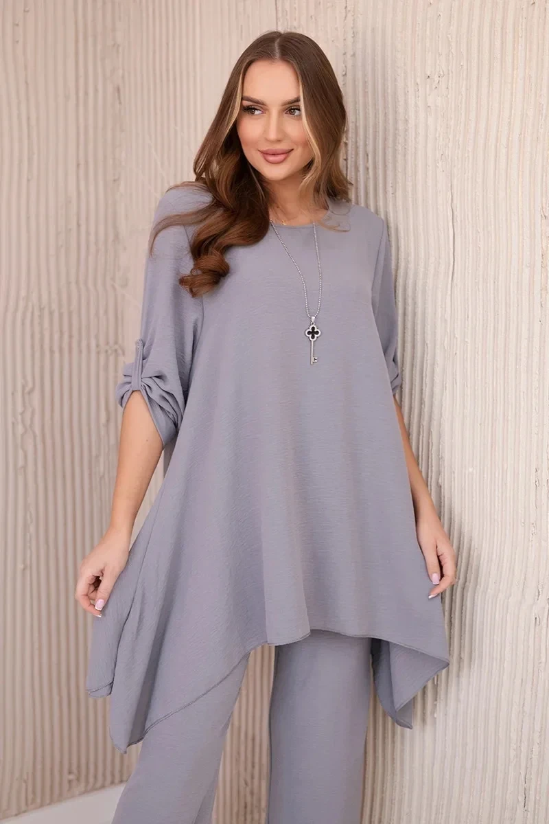 Italská dvoudílná souprava skládající se z rozšířené halenky a kalhot je elegantní souprava, která dodá kouzlo a styl každému stylu. Rozevlátá halenka dodává jemnou ženskost, zvýrazňuje postavu a zároveň zajišťuje volnost pohybu. Klasický střih kalhot dokonale ladí s elegantní halenkou a tvoří tak ucelený a stylový celek. Přívěsek ve tvaru klíče je navíc okouzlujícím detailem, který dodává této sadě originalitu a charakter a vytváří harmonickou kompozici. Jde o elegantní doplněk, který zdůrazňuje jedinečnost a smysl pro detail v celém stylingu. Tato italská souprava je ideální pro mnoho příležitostí, od obchodních schůzek až po romantická rande. Toto je rafinovaná volba pro lidi, kteří oceňují eleganci a pohodlí v jednom. Velikost je univerzální a padne ženám, které nosí velikost S, M nebo L.