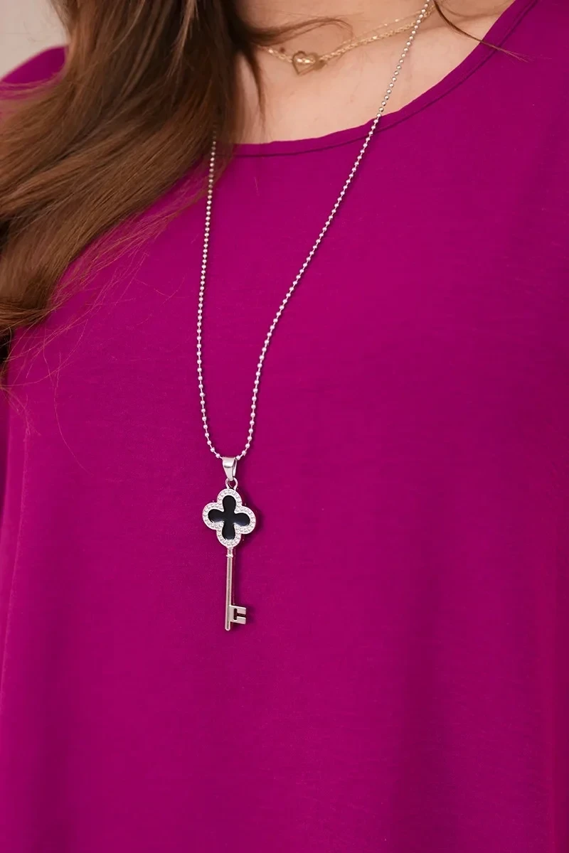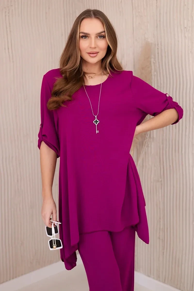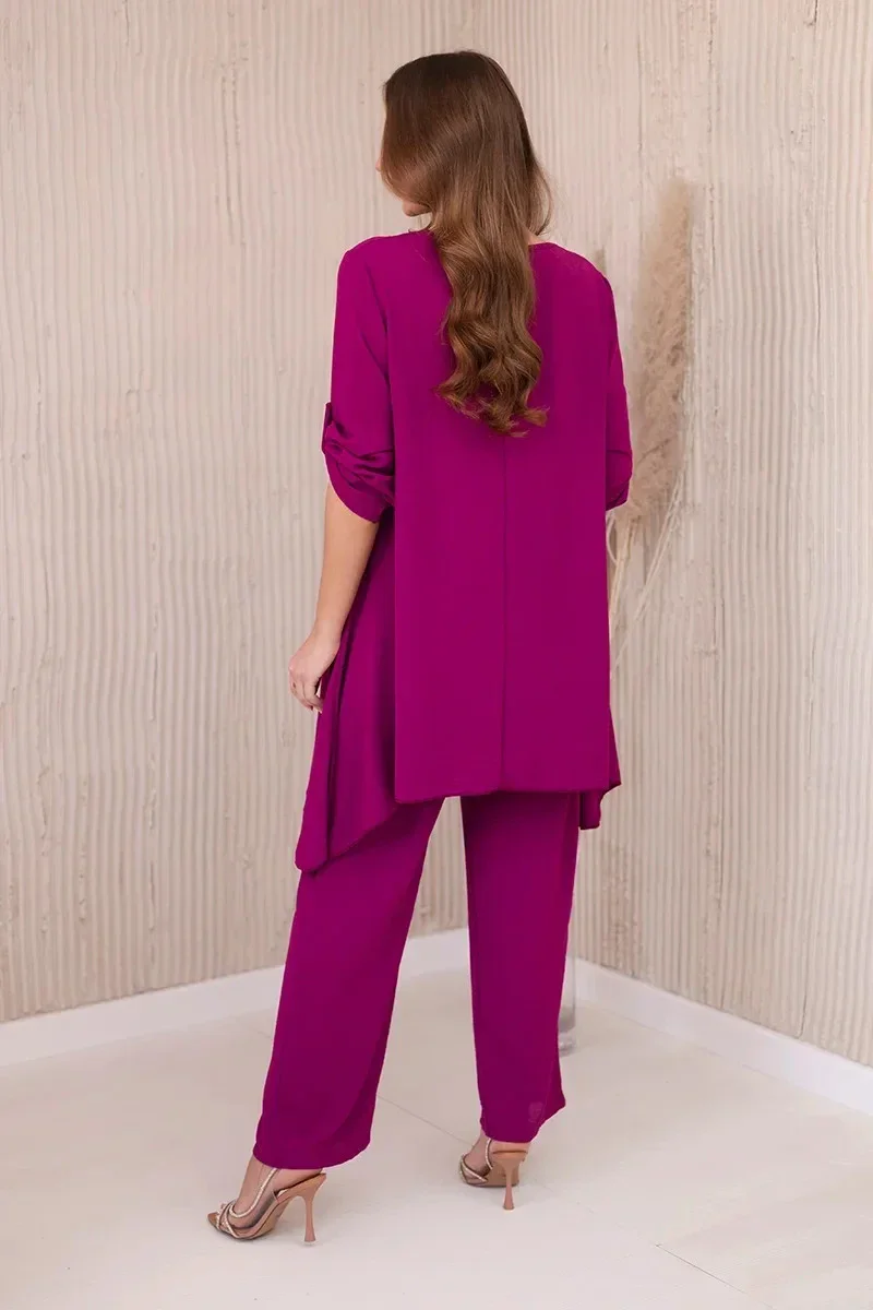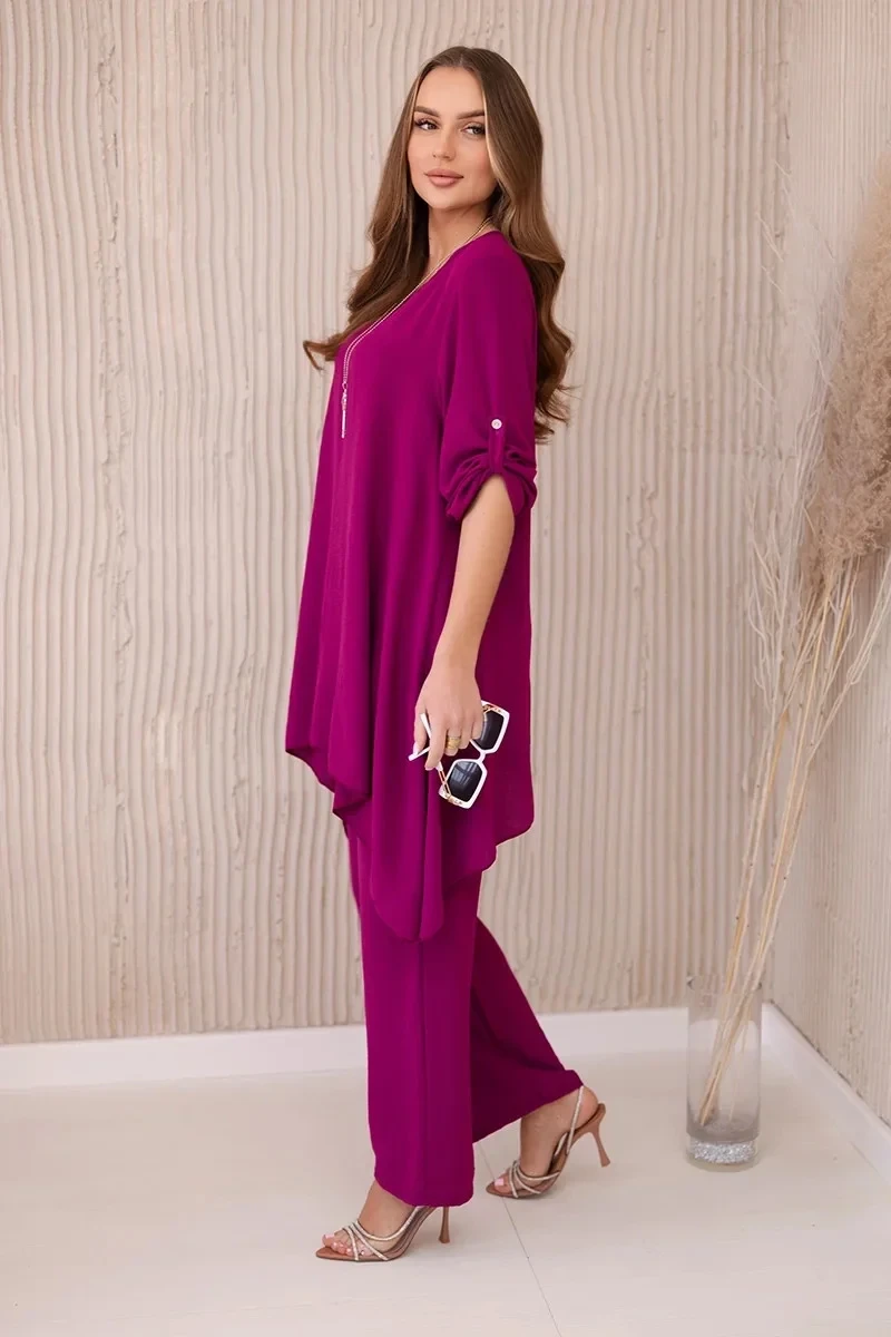 Italská dvoudílná souprava skládající se z rozšířené halenky a kalhot je elegantní souprava, která dodá kouzlo a styl každému stylu. Rozevlátá halenka dodává jemnou ženskost, zvýrazňuje postavu a zároveň zajišťuje volnost pohybu. Klasický střih kalhot dokonale ladí s elegantní halenkou a tvoří tak ucelený a stylový celek. Přívěsek ve tvaru klíče je navíc okouzlujícím detailem, který dodává této sadě originalitu a charakter a vytváří harmonickou kompozici. Jde o elegantní doplněk, který zdůrazňuje jedinečnost a smysl pro detail v celém stylingu. Tato italská souprava je ideální pro mnoho příležitostí, od obchodních schůzek až po romantická rande. Toto je rafinovaná volba pro lidi, kteří oceňují eleganci a pohodlí v jednom. Velikost je univerzální a padne ženám, které nosí velikost S, M nebo L.