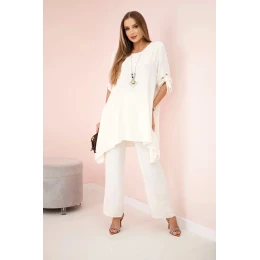 Italská dvoudílná souprava skládající se z rozšířené halenky a kalhot je elegantní souprava, která dodá kouzlo a styl každému stylu. Rozevlátá halenka dodává jemnou ženskost, zvýrazňuje postavu a zároveň zajišťuje volnost pohybu. Klasický střih kalhot dokonale ladí s elegantní halenkou a tvoří tak ucelený a stylový celek. Přívěsek ve tvaru klíče je navíc okouzlujícím detailem, který dodává této sadě originalitu a charakter a vytváří harmonickou kompozici. Jde o elegantní doplněk, který zdůrazňuje jedinečnost a smysl pro detail v celém stylingu. Tato italská souprava je ideální pro mnoho příležitostí, od obchodních schůzek až po romantická rande. Toto je rafinovaná volba pro lidi, kteří oceňují eleganci a pohodlí v jednom. Velikost je univerzální a padne ženám, které nosí velikost S, M nebo L.