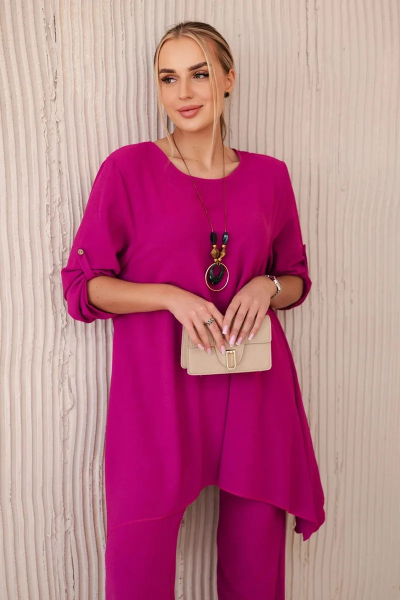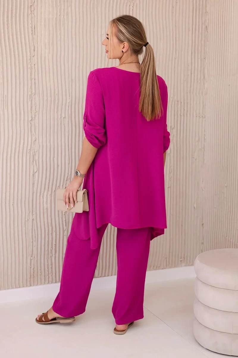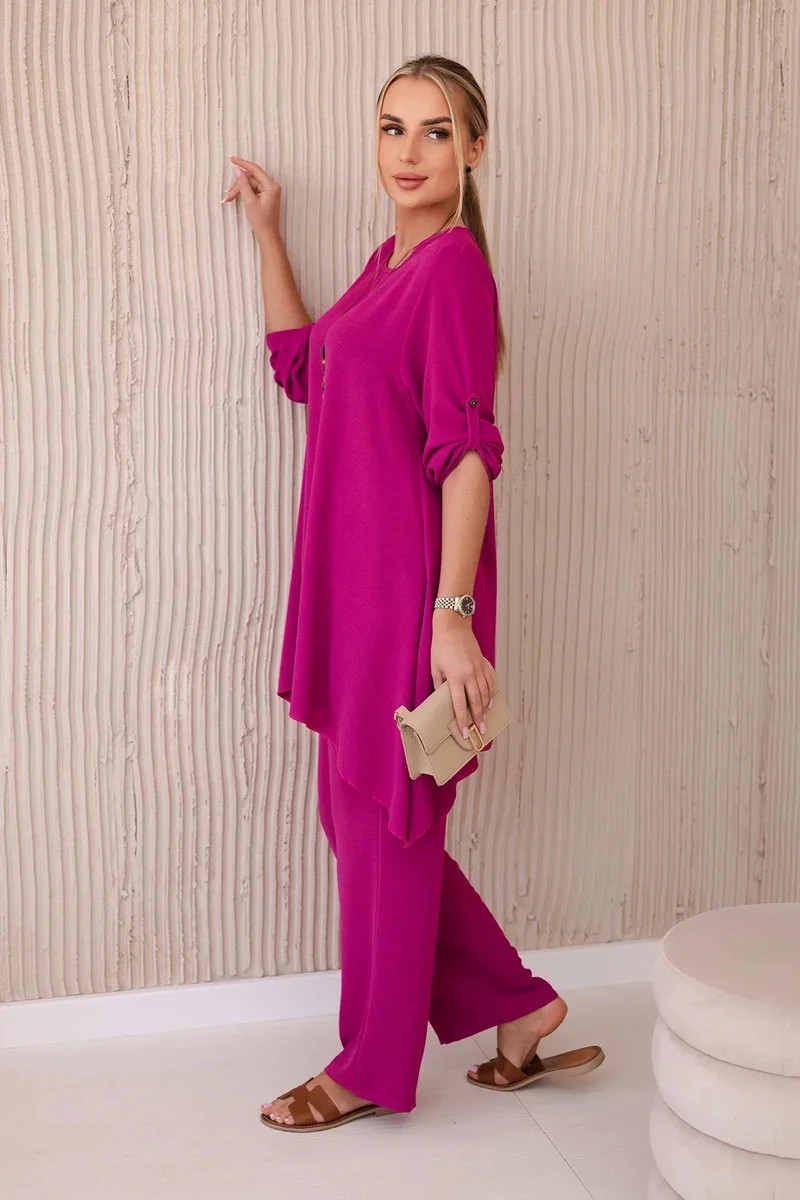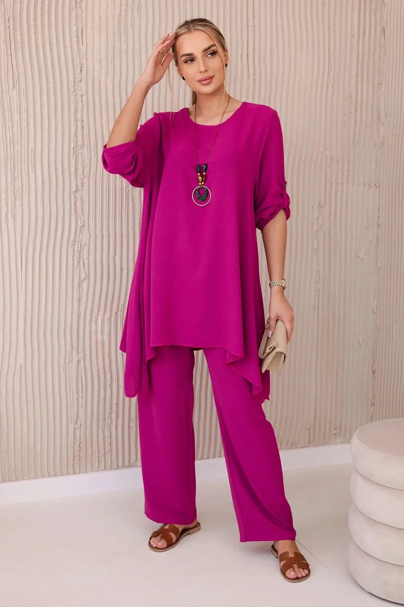 Italská dvoudílná souprava skládající se z rozšířené halenky a kalhot je elegantní souprava, která dodá kouzlo a styl každému stylu. Rozevlátá halenka dodává jemnou ženskost, zvýrazňuje postavu a zároveň zajišťuje volnost pohybu. Klasický střih kalhot dokonale ladí s elegantní halenkou a tvoří tak ucelený a stylový celek. Přívěsek ve tvaru klíče je navíc okouzlujícím detailem, který dodává této sadě originalitu a charakter a vytváří harmonickou kompozici. Jde o elegantní doplněk, který zdůrazňuje jedinečnost a smysl pro detail v celém stylingu. Tato italská souprava je ideální pro mnoho příležitostí, od obchodních schůzek až po romantická rande. Toto je rafinovaná volba pro lidi, kteří oceňují eleganci a pohodlí v jednom. Velikost je univerzální a padne ženám, které nosí velikost S, M nebo L.