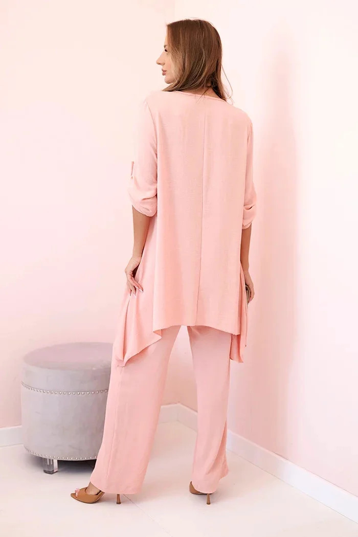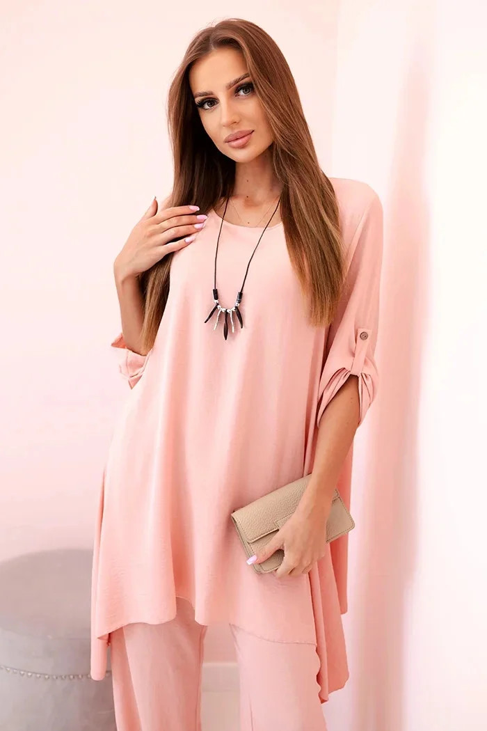 Italská dvoudílná souprava skládající se z rozšířené halenky a kalhot je elegantní souprava, která dodá kouzlo a styl každému stylu. Rozevlátá halenka dodává jemnou ženskost, zvýrazňuje postavu a zároveň zajišťuje volnost pohybu. Klasický střih kalhot dokonale ladí s elegantní halenkou a tvoří tak ucelený a stylový celek. Přívěsek ve tvaru klíče je navíc okouzlujícím detailem, který dodává této sadě originalitu a charakter a vytváří harmonickou kompozici. Jde o elegantní doplněk, který zdůrazňuje jedinečnost a smysl pro detail v celém stylingu. Tato italská souprava je ideální pro mnoho příležitostí, od obchodních schůzek až po romantická rande. Toto je rafinovaná volba pro lidi, kteří oceňují eleganci a pohodlí v jednom. Velikost je univerzální a padne ženám, které nosí velikost S, M nebo L.