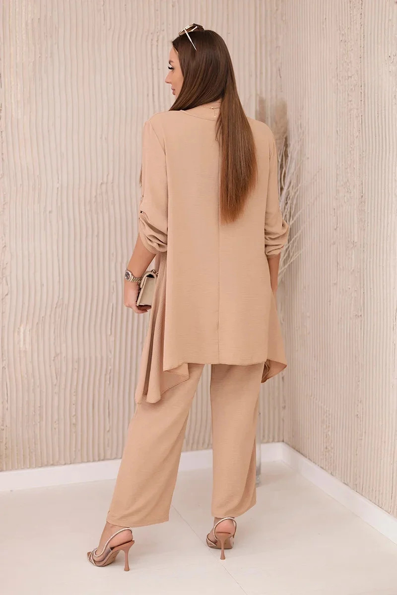 Italská dvoudílná souprava skládající se z rozšířené halenky a kalhot je elegantní souprava, která dodá kouzlo a styl každému stylu. Rozevlátá halenka dodává jemnou ženskost, zvýrazňuje postavu a zároveň zajišťuje volnost pohybu. Klasický střih kalhot dokonale ladí s elegantní halenkou a tvoří tak ucelený a stylový celek. Přívěsek ve tvaru klíče je navíc okouzlujícím detailem, který dodává této sadě originalitu a charakter a vytváří harmonickou kompozici. Jde o elegantní doplněk, který zdůrazňuje jedinečnost a smysl pro detail v celém stylingu. Tato italská souprava je ideální pro mnoho příležitostí, od obchodních schůzek až po romantická rande. Toto je rafinovaná volba pro lidi, kteří oceňují eleganci a pohodlí v jednom. Velikost je univerzální a padne ženám, které nosí velikost S, M nebo L.