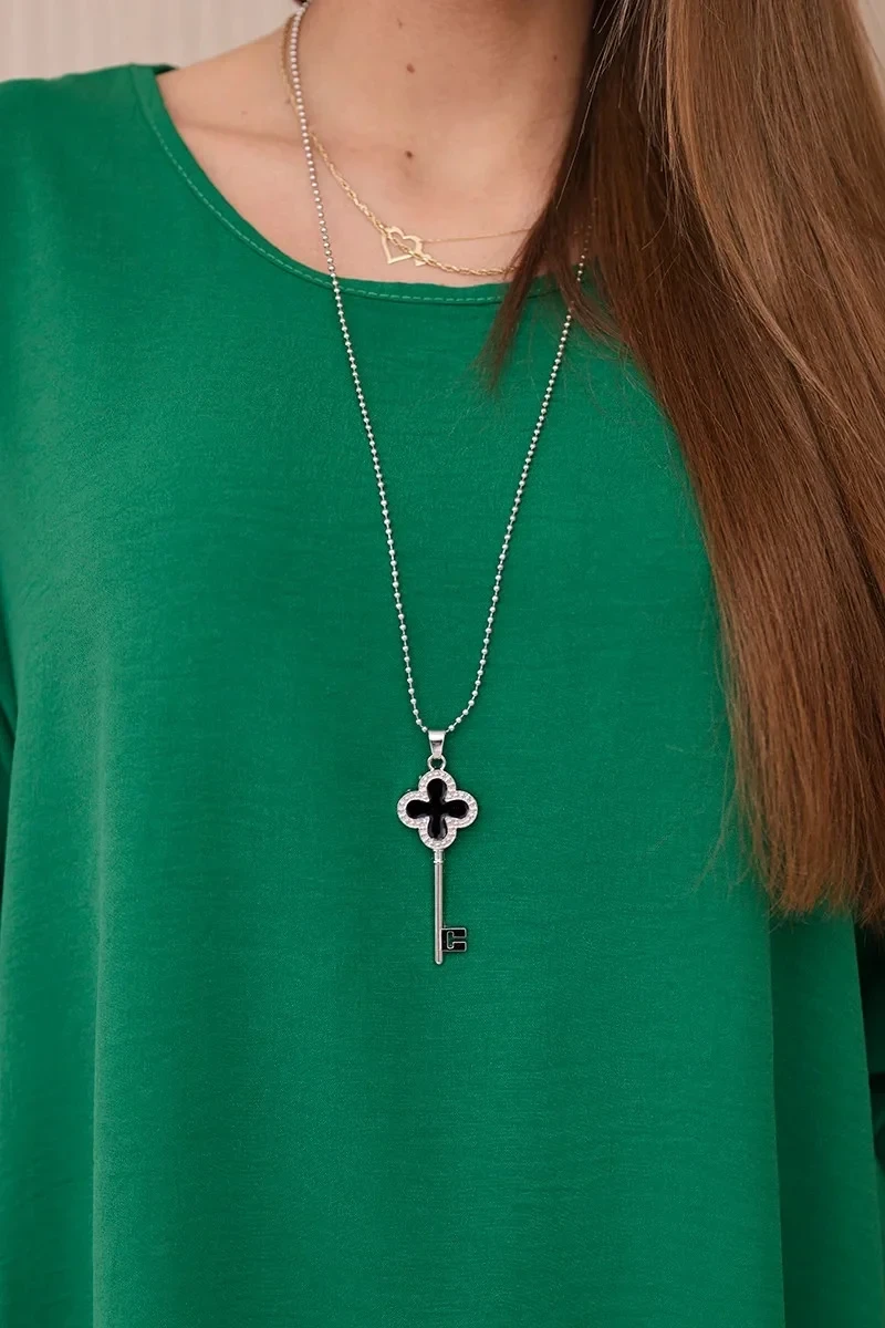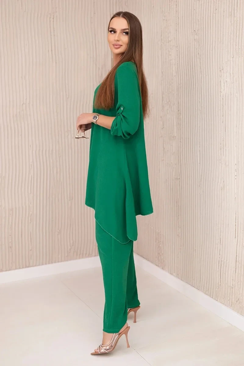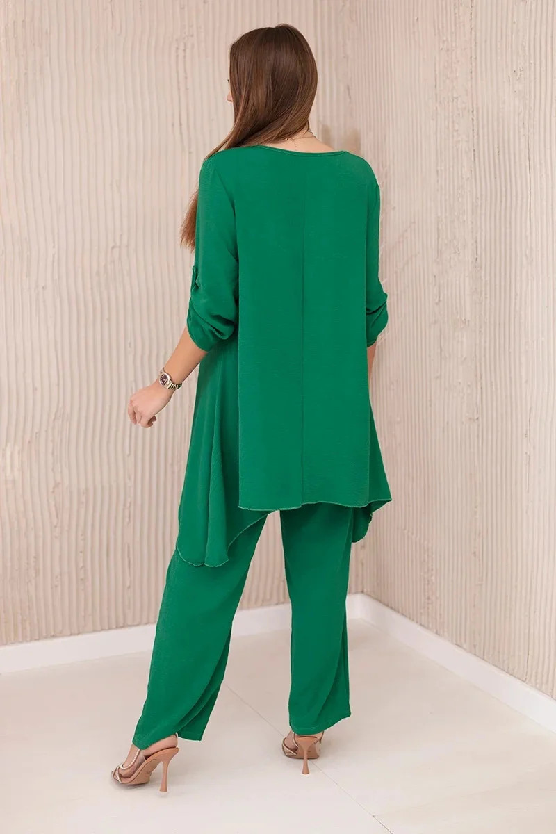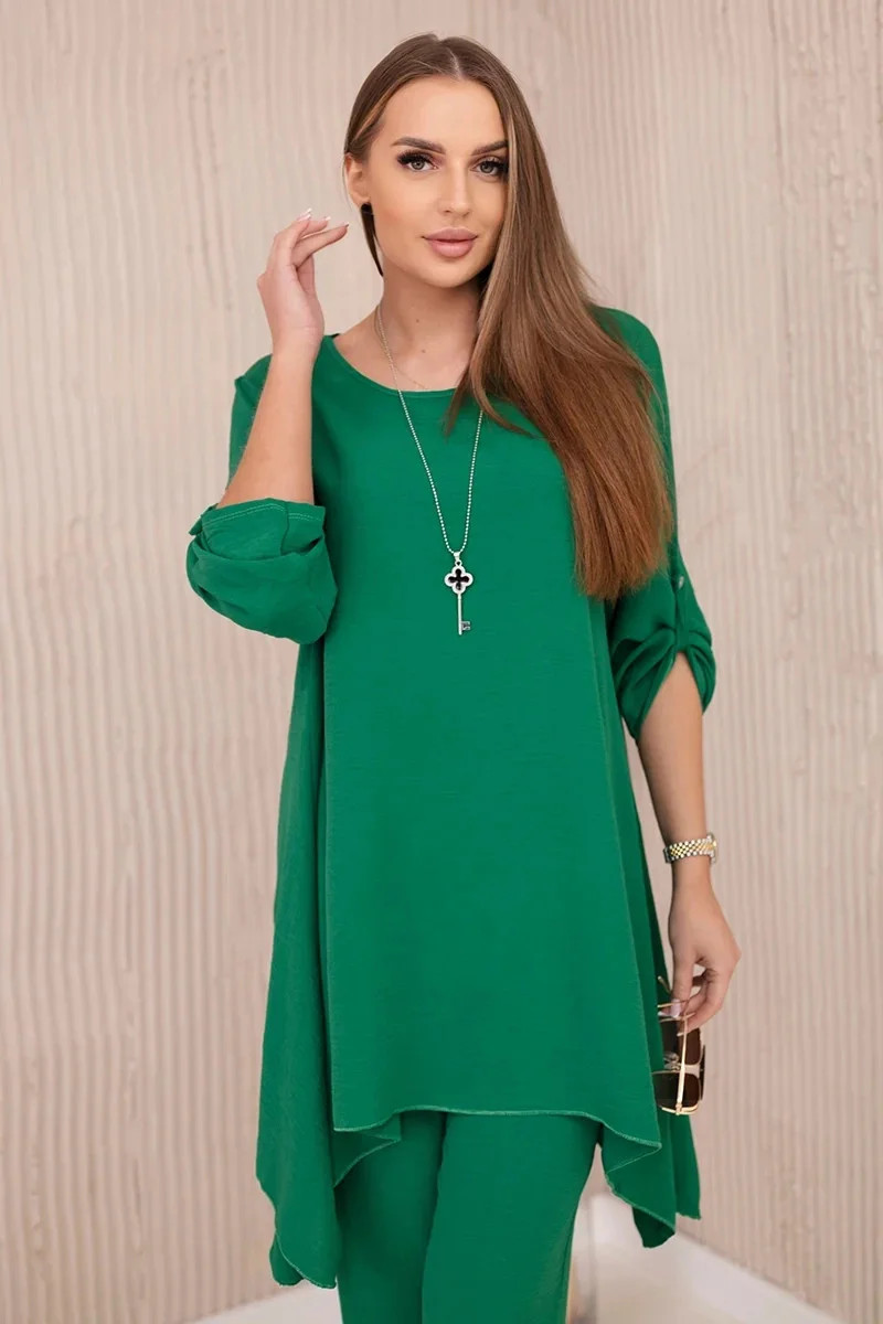 Italská dvoudílná souprava skládající se z rozšířené halenky a kalhot je elegantní souprava, která dodá kouzlo a styl každému stylu. Rozevlátá halenka dodává jemnou ženskost, zvýrazňuje postavu a zároveň zajišťuje volnost pohybu. Klasický střih kalhot dokonale ladí s elegantní halenkou a tvoří tak ucelený a stylový celek. Přívěsek ve tvaru klíče je navíc okouzlujícím detailem, který dodává této sadě originalitu a charakter a vytváří harmonickou kompozici. Jde o elegantní doplněk, který zdůrazňuje jedinečnost a smysl pro detail v celém stylingu. Tato italská souprava je ideální pro mnoho příležitostí, od obchodních schůzek až po romantická rande. Toto je rafinovaná volba pro lidi, kteří oceňují eleganci a pohodlí v jednom. Velikost je univerzální a padne ženám, které nosí velikost S, M nebo L.