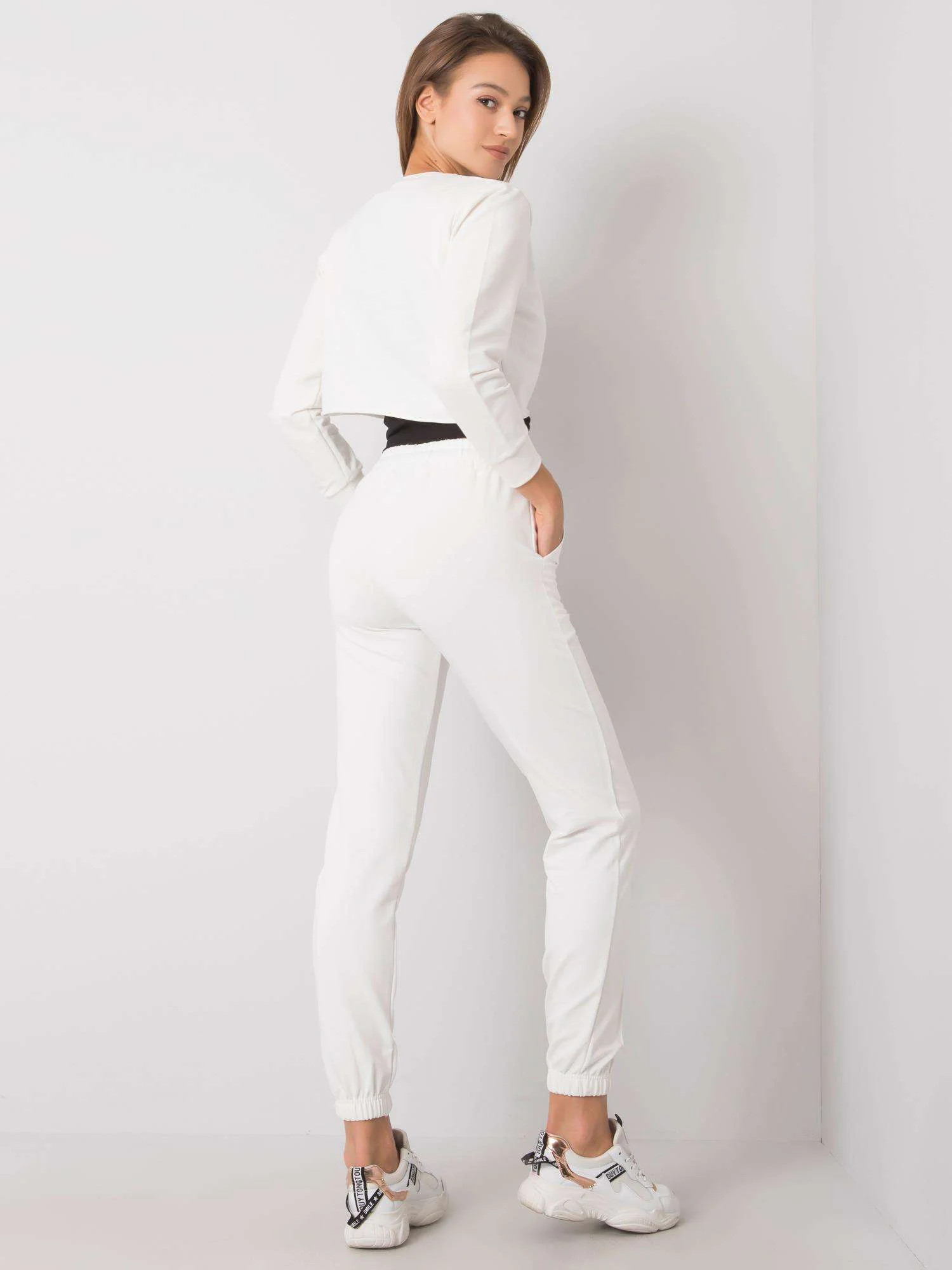 Wymiary kompletu w rozmiarze S mierzone na płasko: bluza - szerokość pod pachami - 51 cm, długość całkowita - 42 cm, długość rękawa - 54 cm, spodnie - szerokość w pasie - 36 cm, długość całkowita - 97 cm, top - szerokość pod pachami - 39 cm, długość całkowita - 47 cm