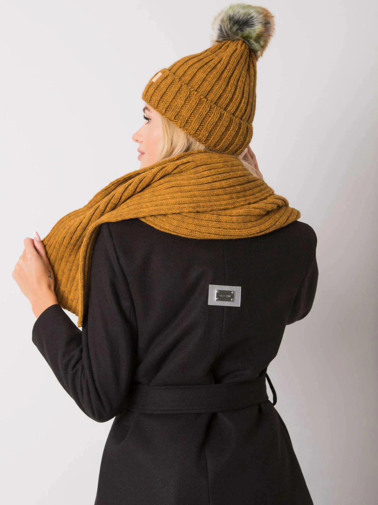 RUE PARIS Tmavě žlutý zimní set čepice a šály Made in Poland