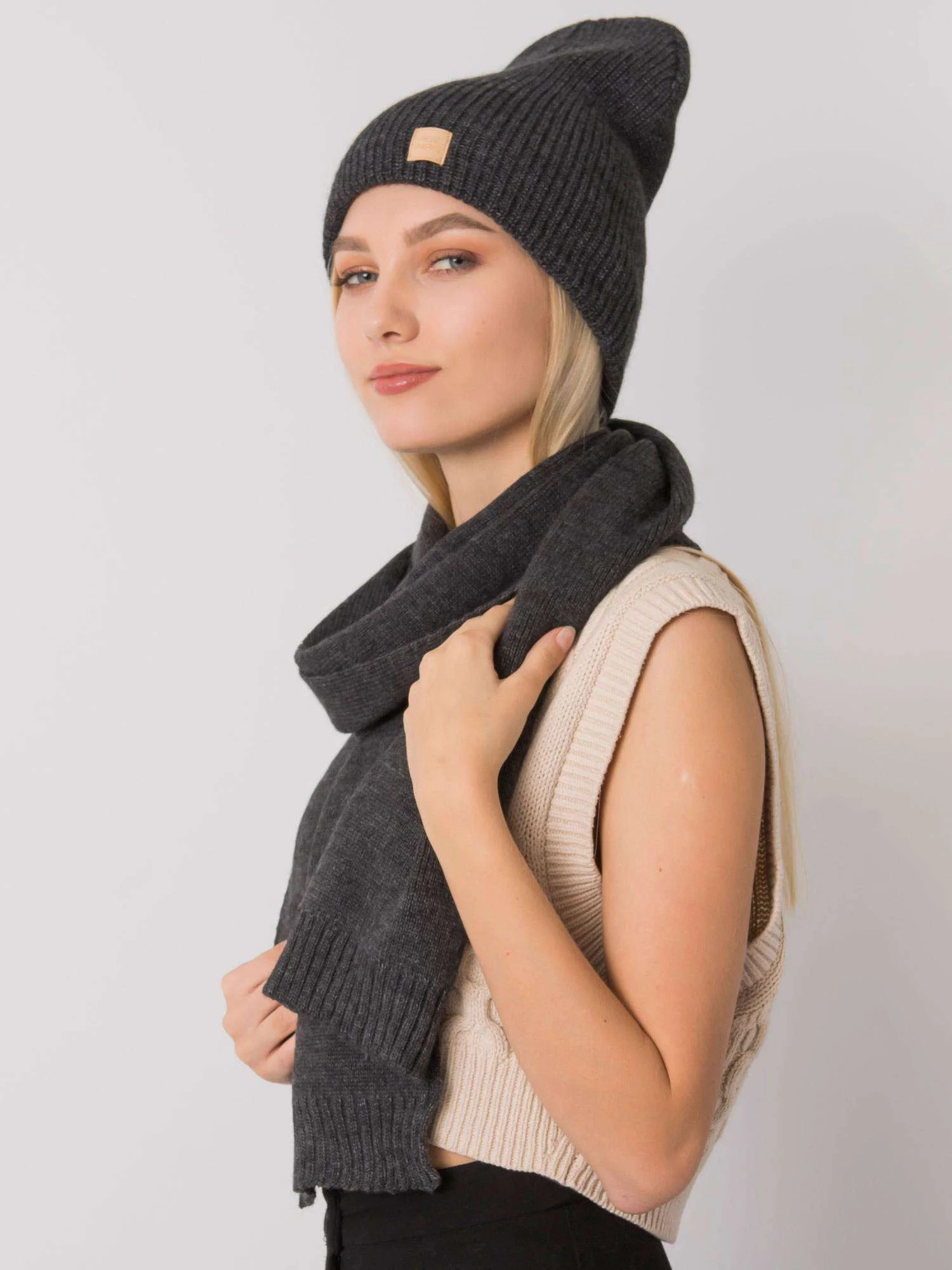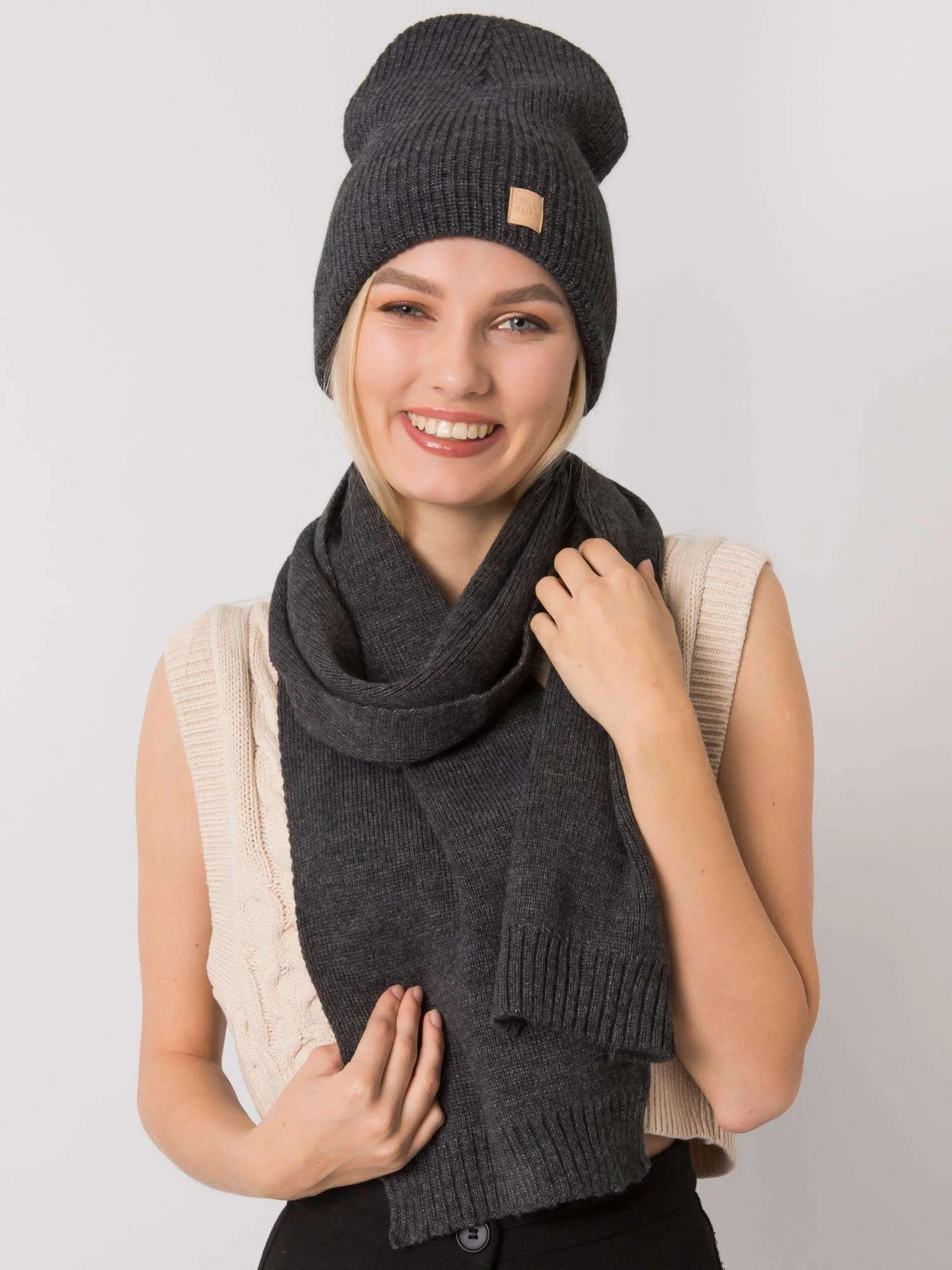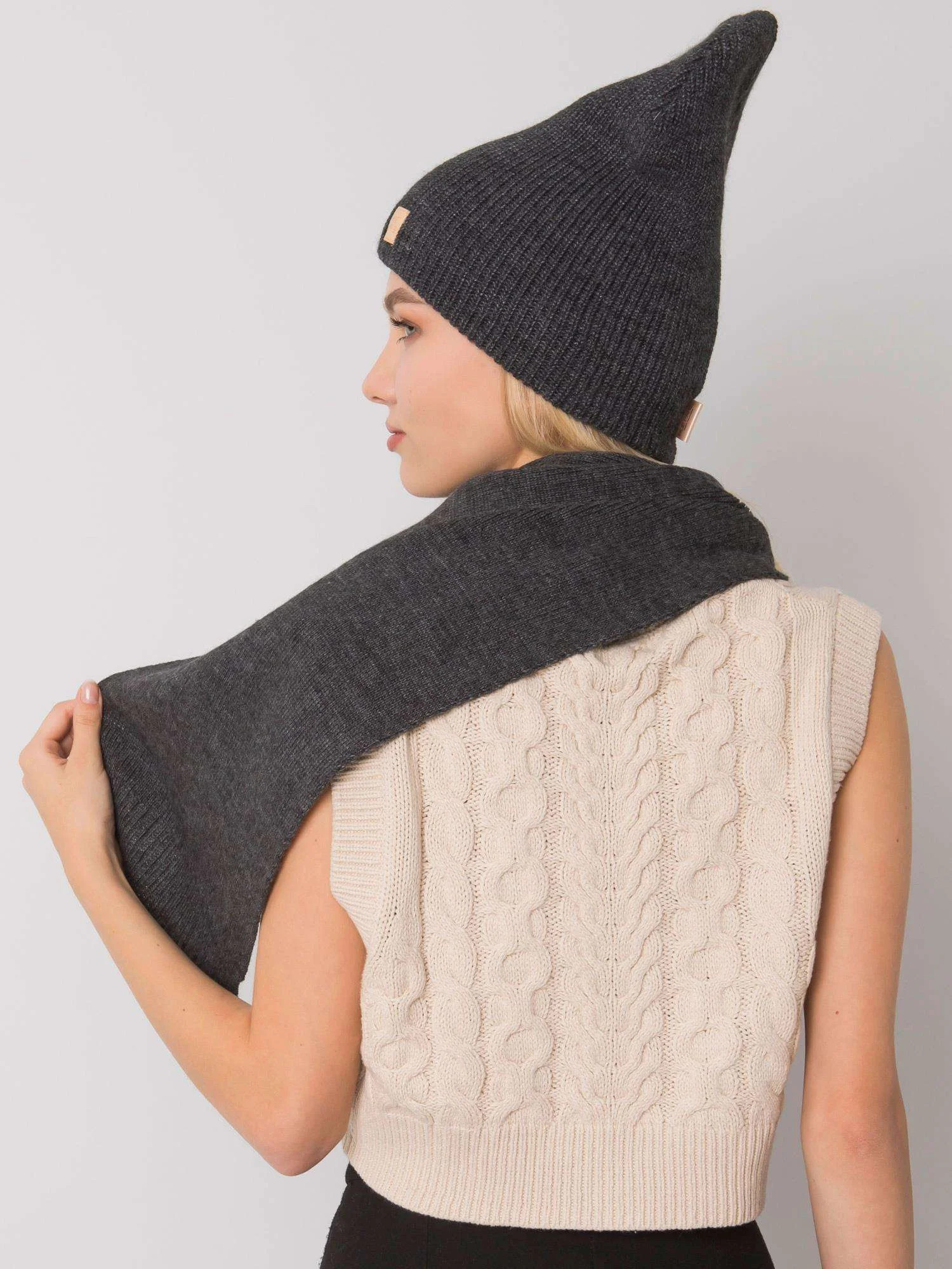 RUE PARIS Tmavě šedá zimní souprava s čepicí a šálou Čepice made in Poland
