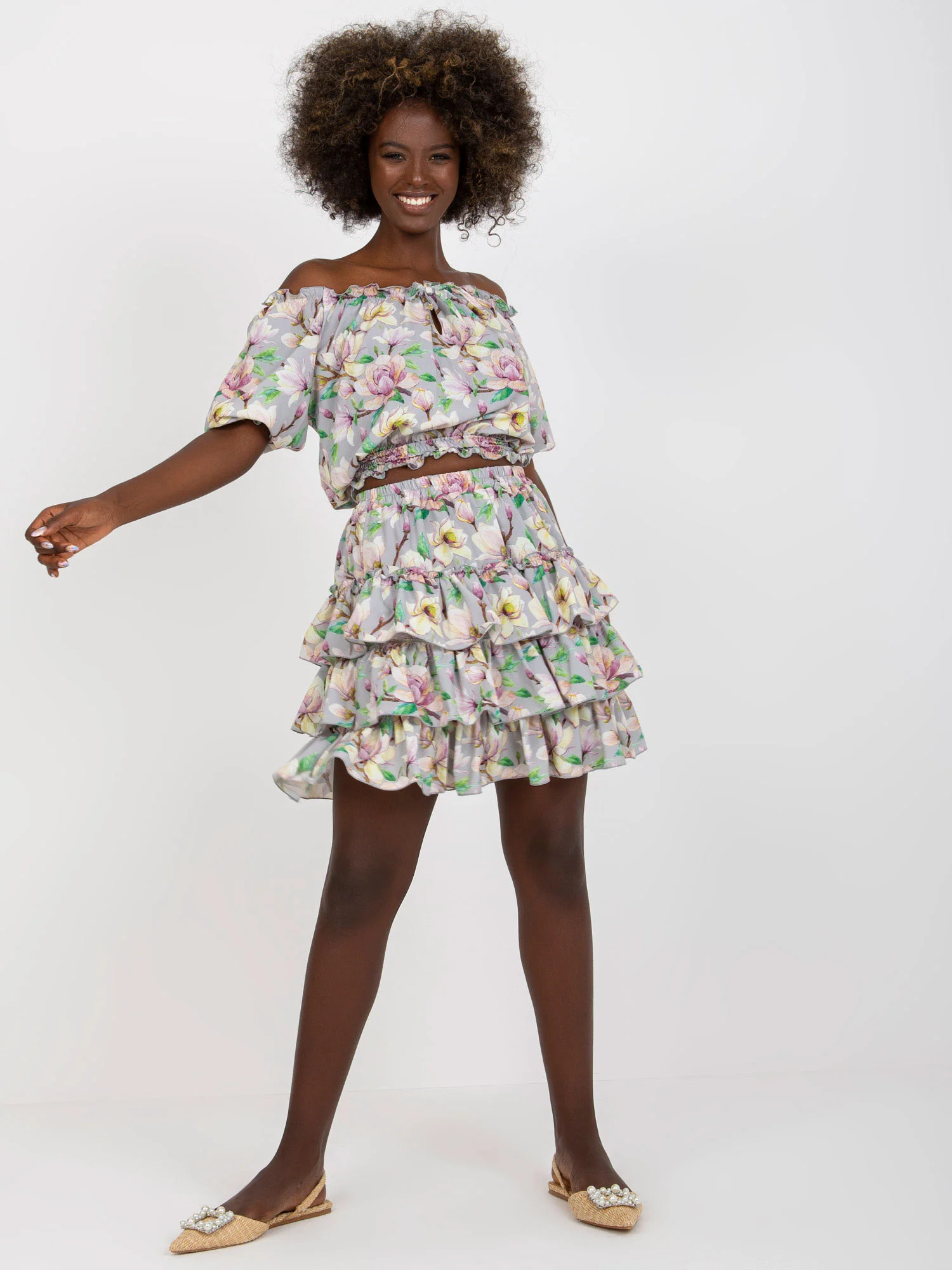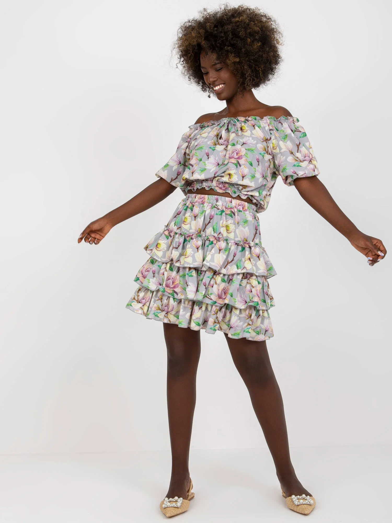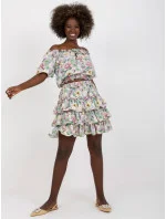 Rozměry soupravy ve velikosti S/M měřené na plocho: šířka halenky v podpaží - 45 cm, délka halenky - 47 cm, šířka sukně v pase - 33 cm, délka sukně - 44 cm.