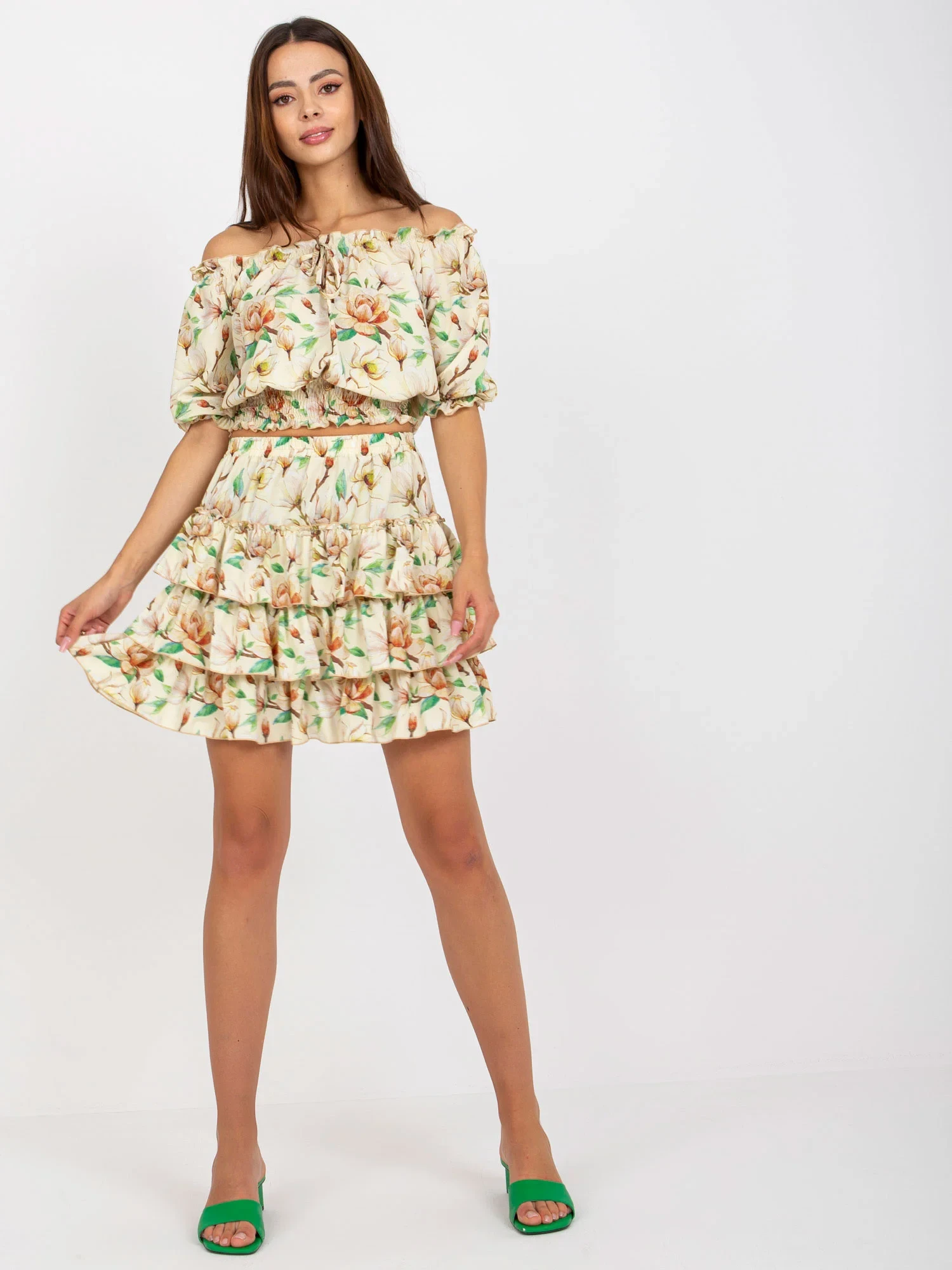 Rozměry soupravy ve velikosti S/M měřené na plocho: šířka halenky v podpaží - 45 cm, délka halenky - 47 cm, šířka sukně v pase - 33 cm, délka sukně - 44 cm.