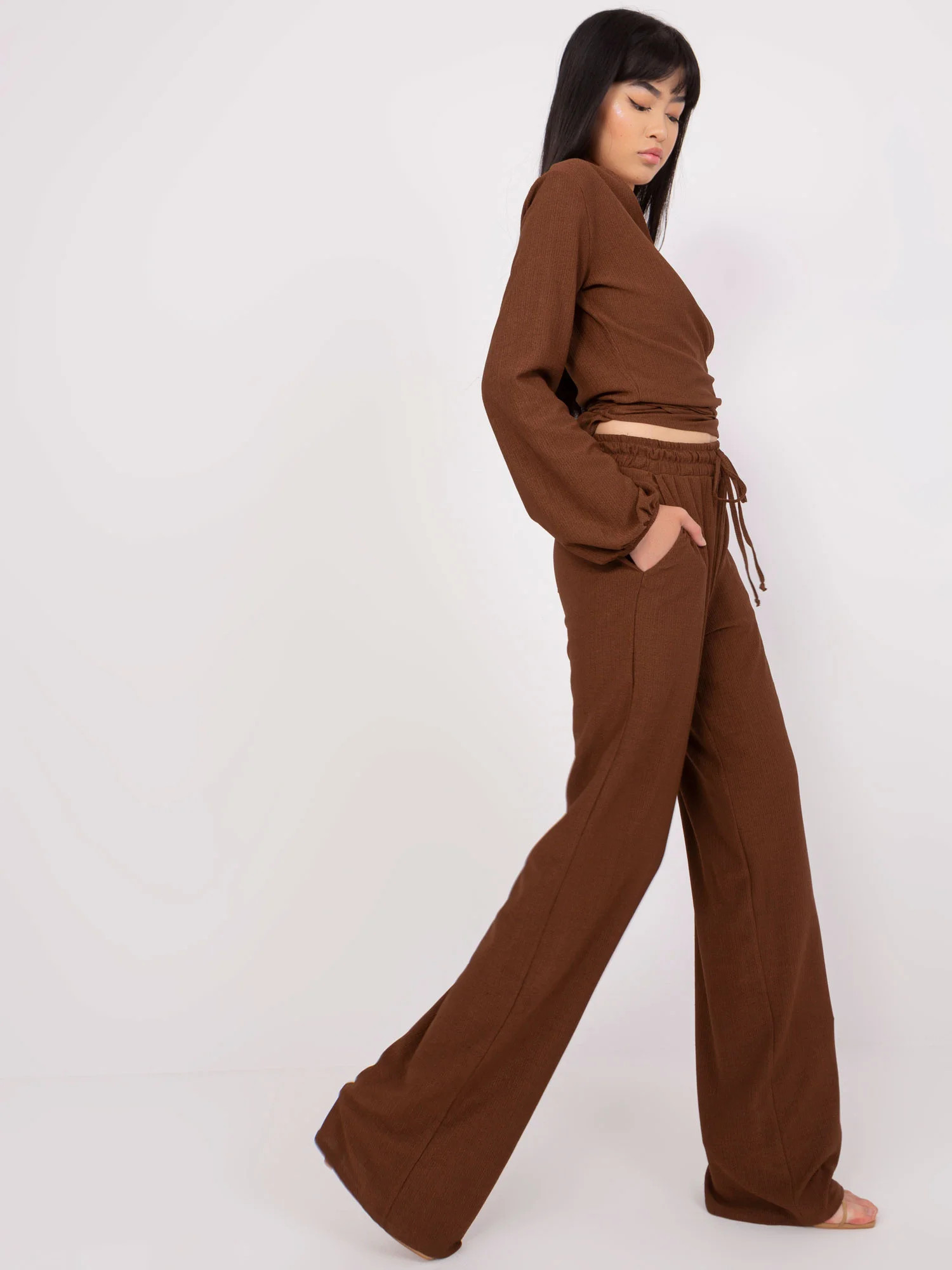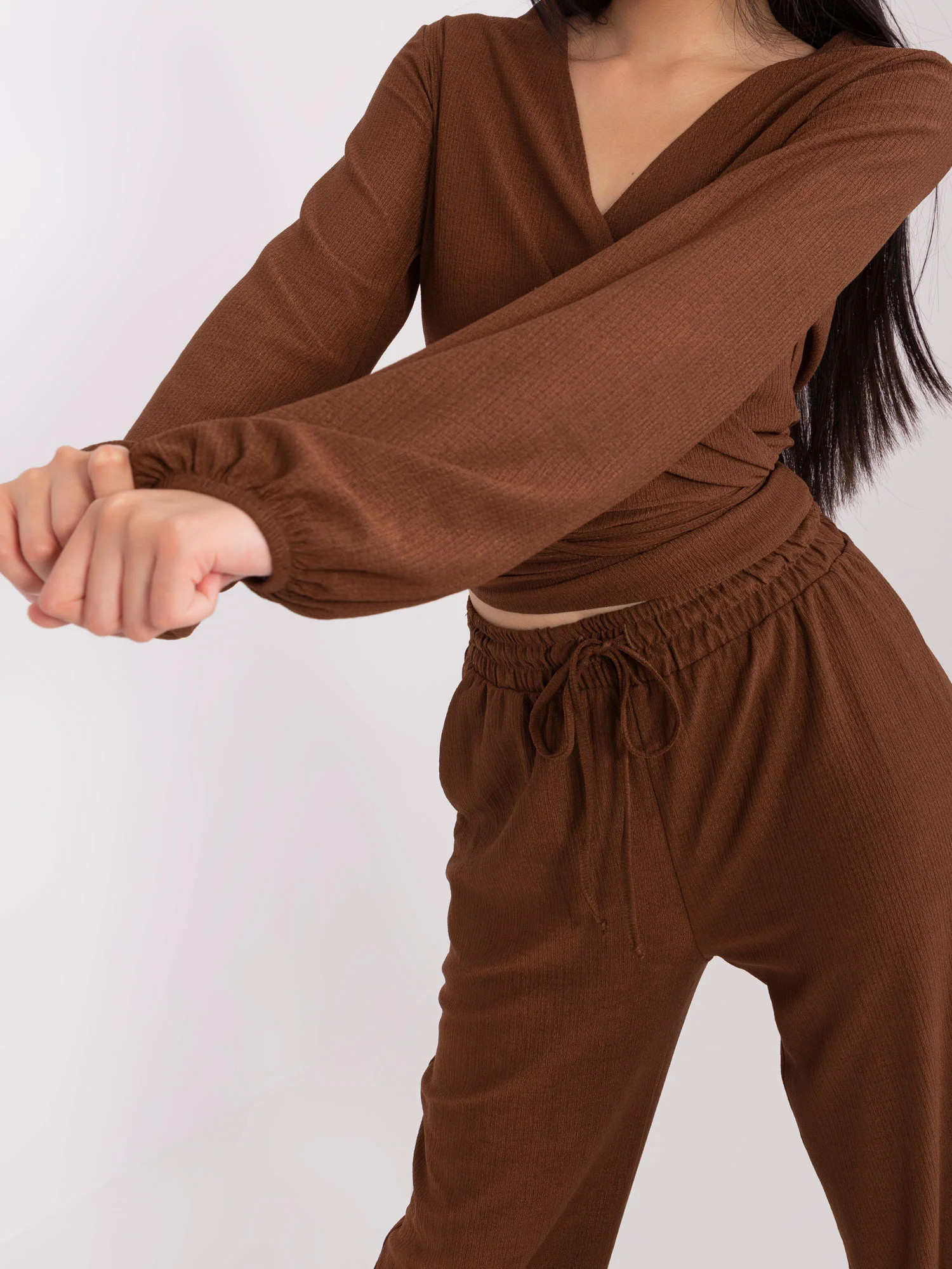 Hnědý dámský ležérní komplet s krátkou halenkou .