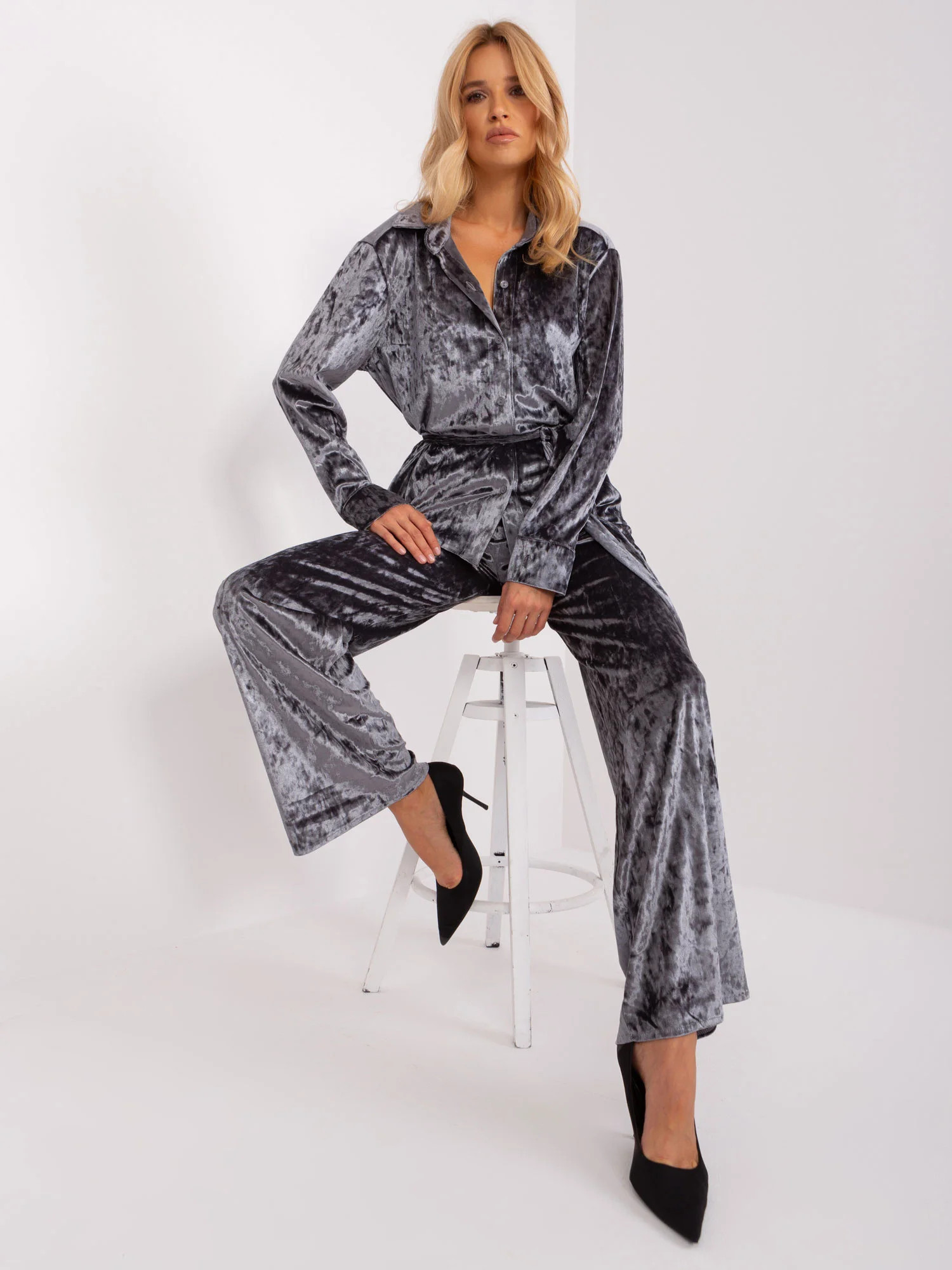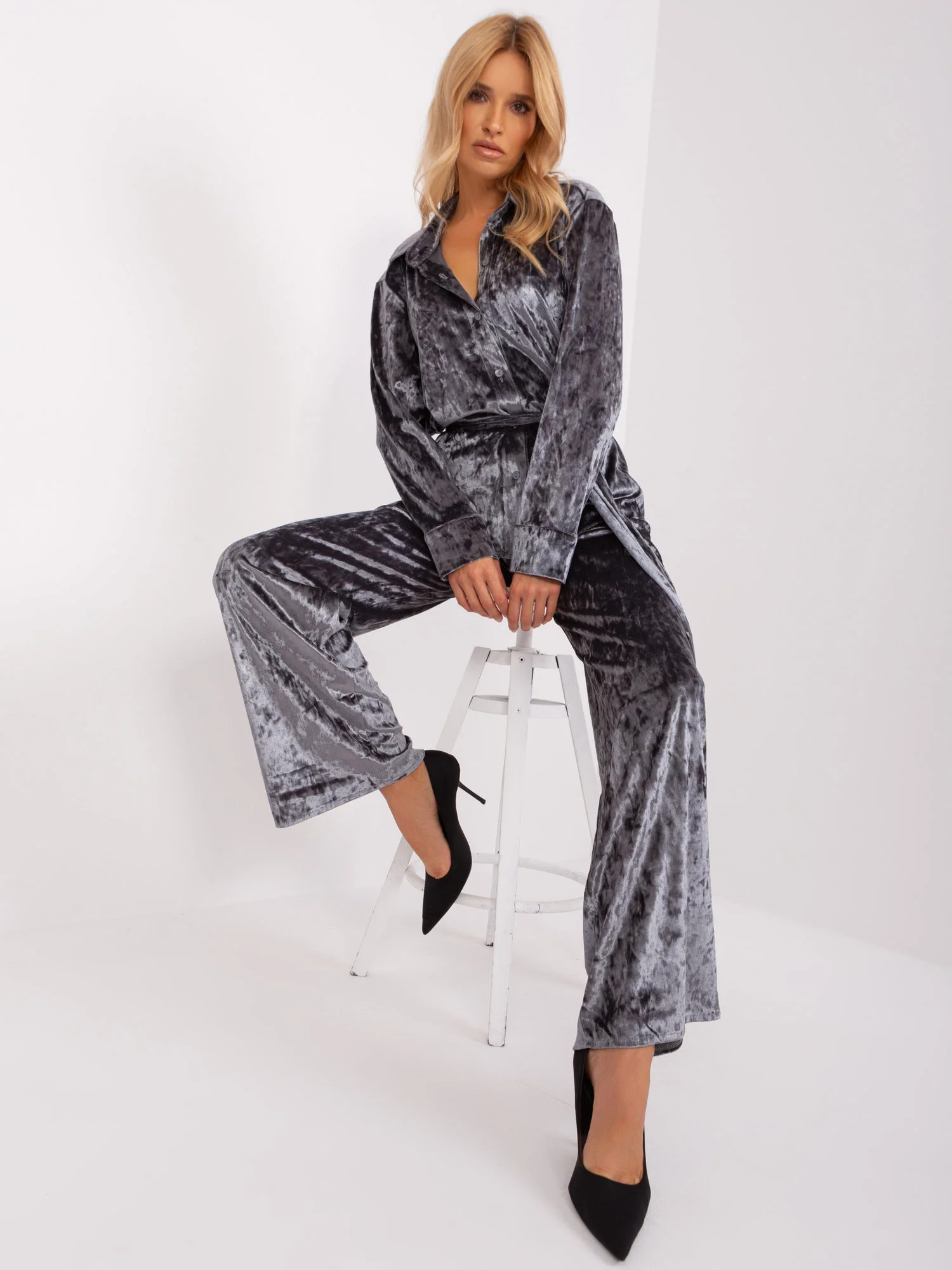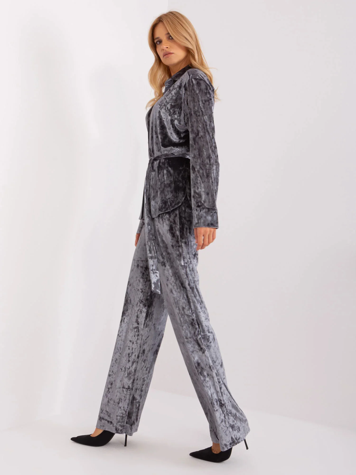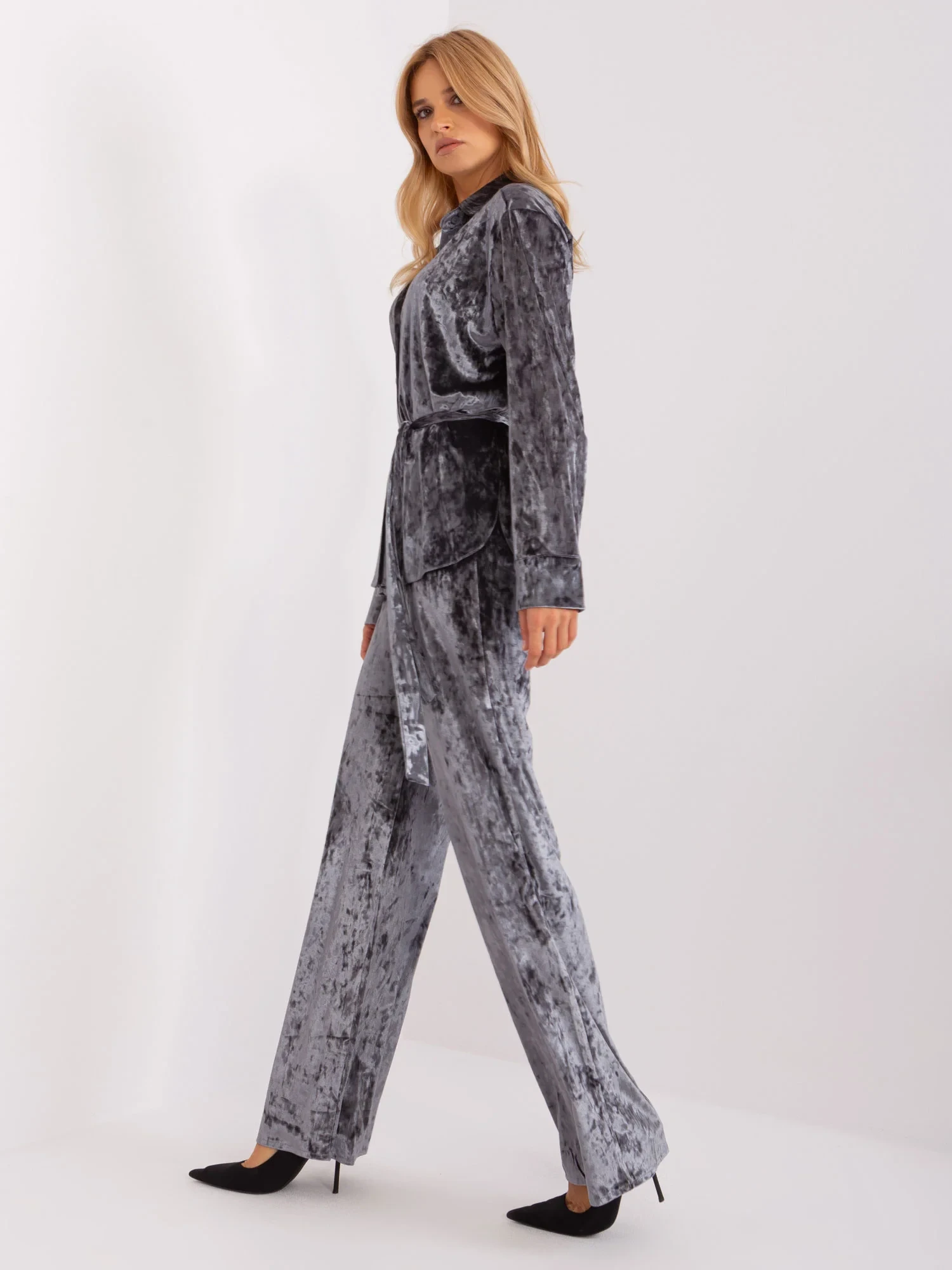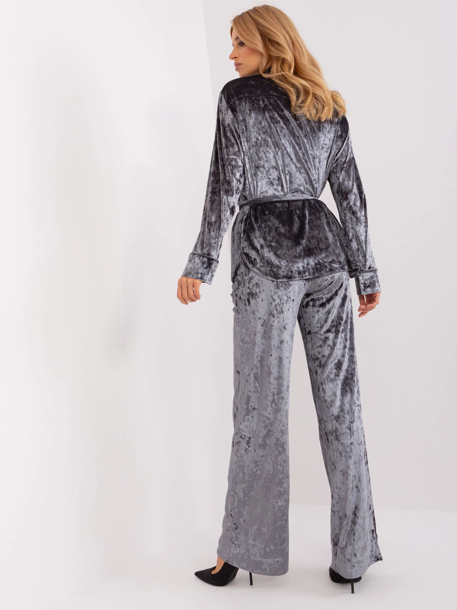 Tmavě šedá velurová souprava s košilí.