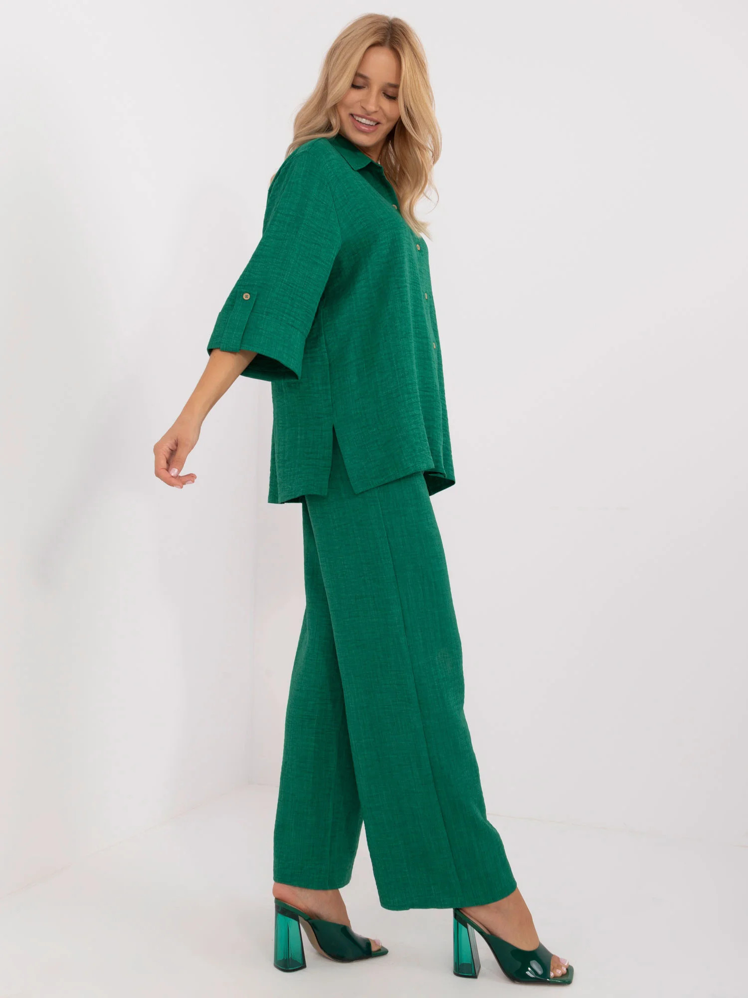 Rozměry soupravy ve velikosti S/M měřené na plocho: šířka košile v podpaží - 62 cm, délka rukávů - 44 cm, délka košile -73 cm, šířka kalhot v pase - 34 cm, délka kalhot - 108 cm.