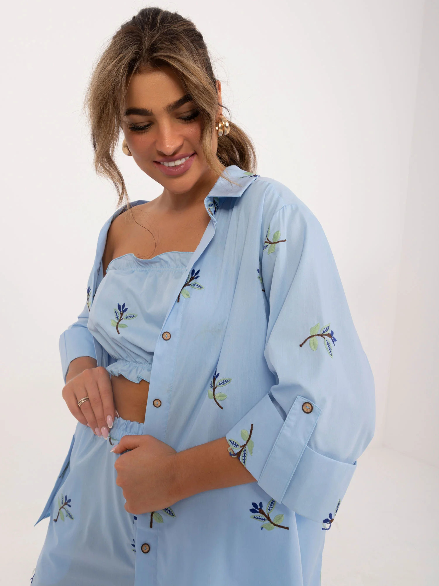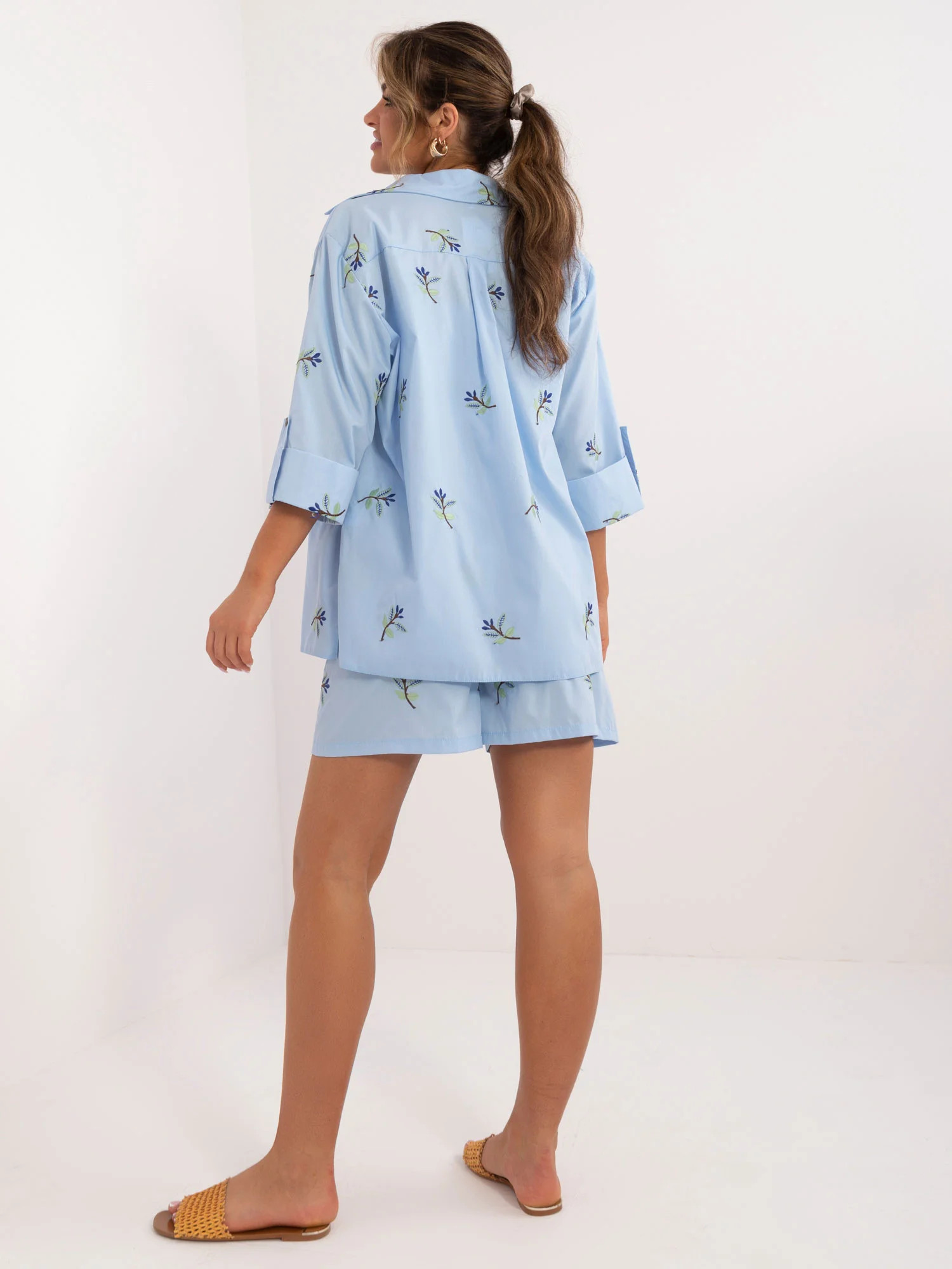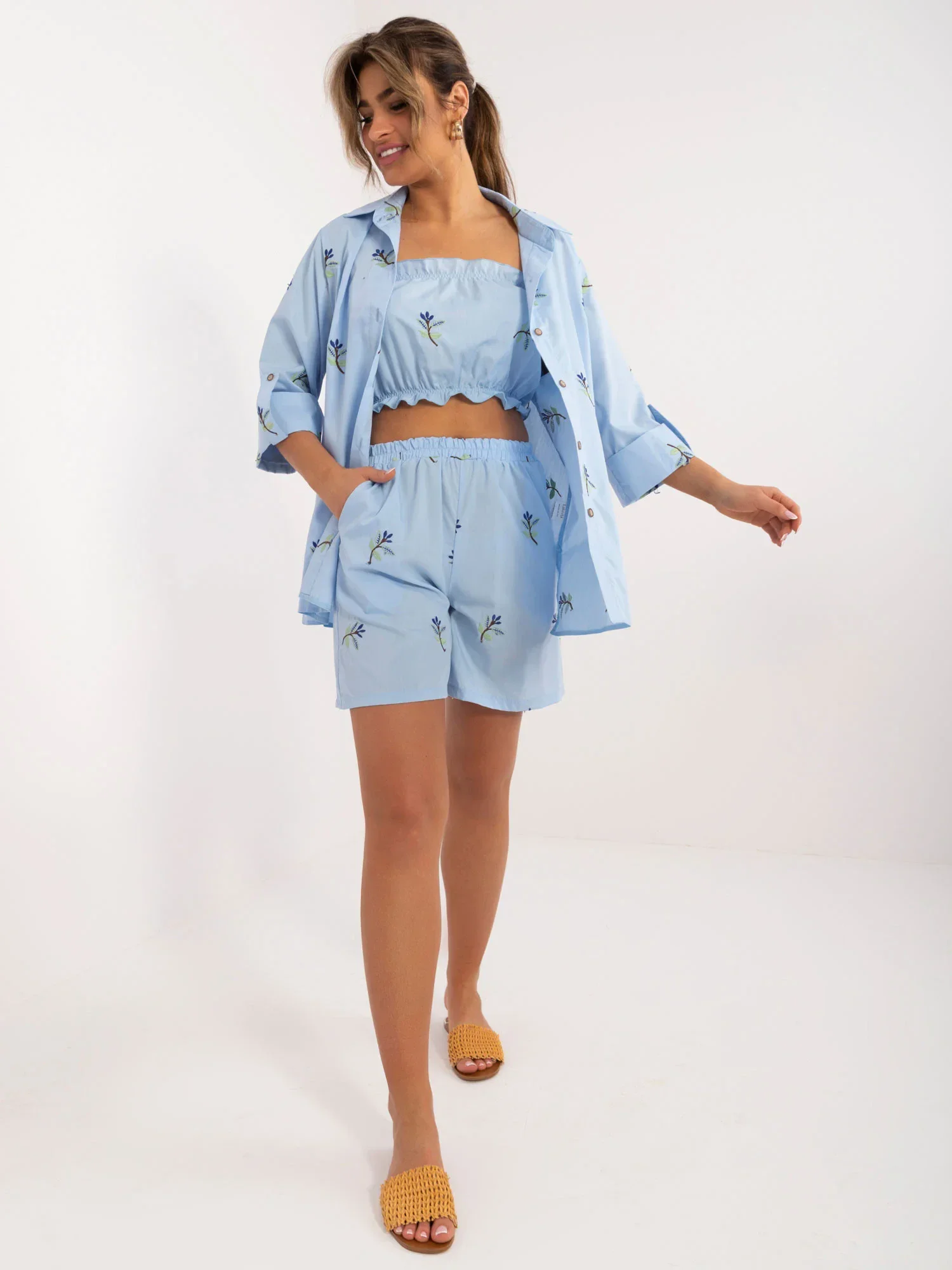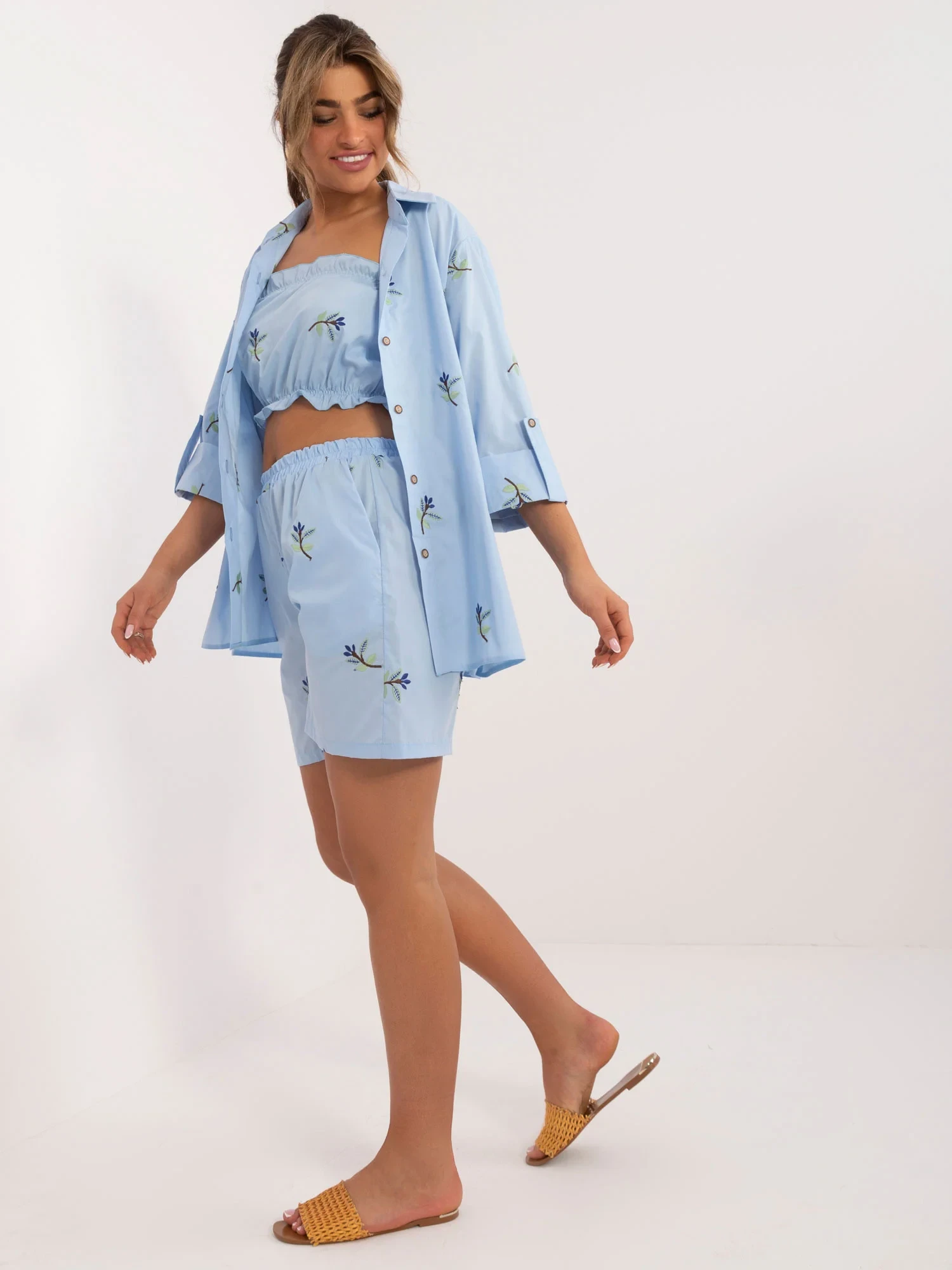 Rozměry soupravy ve velikosti S/M měřené na plocho: šířka trička v podpaží - 45 cm, délka rukávů - 40 cm, délka trička - 72 cm, délka topu -22 cm, šířka topu v podpaží - 32 cm, šířka šortek v pase - 46 cm, délka šortek - 95 cm.