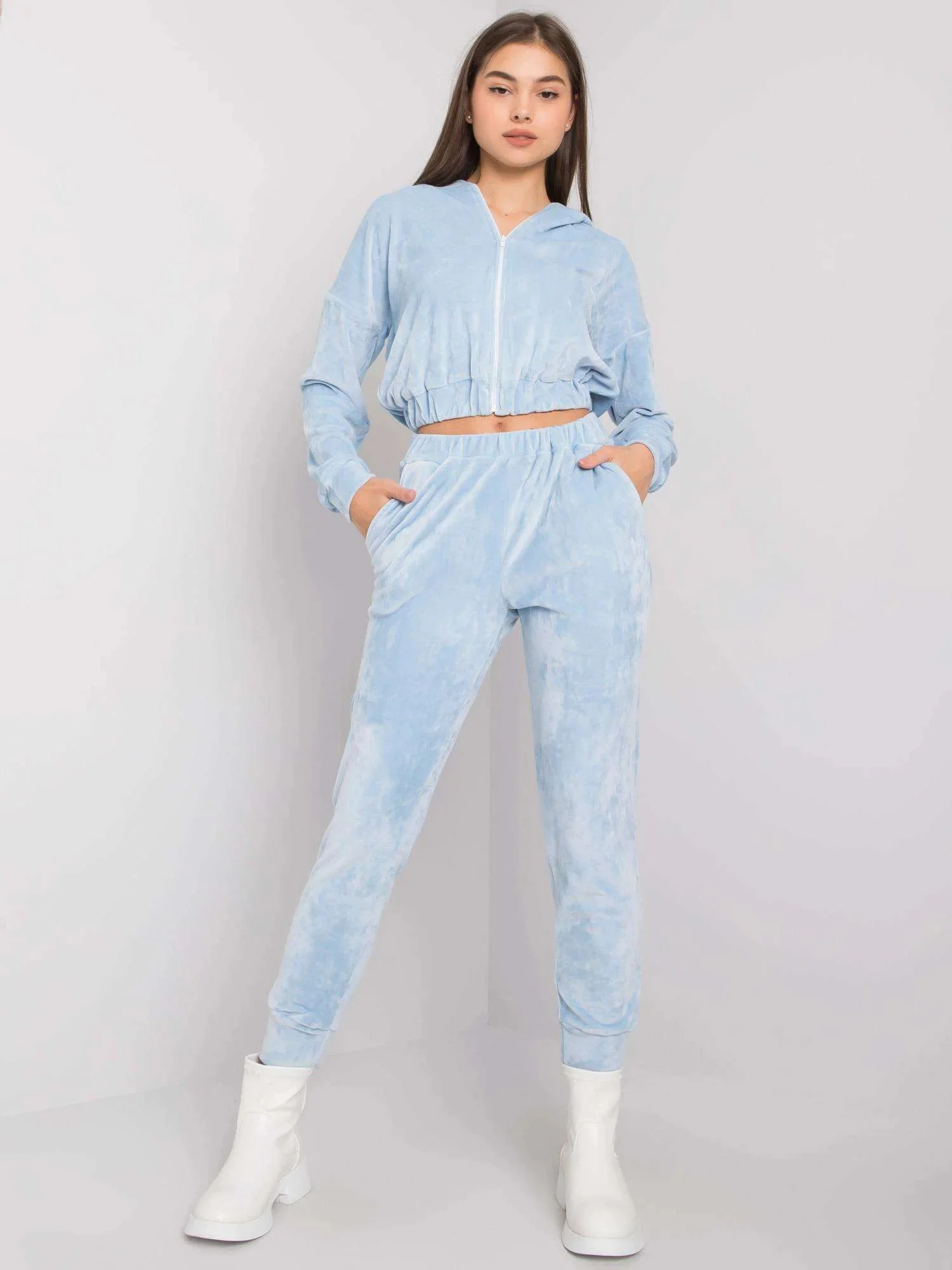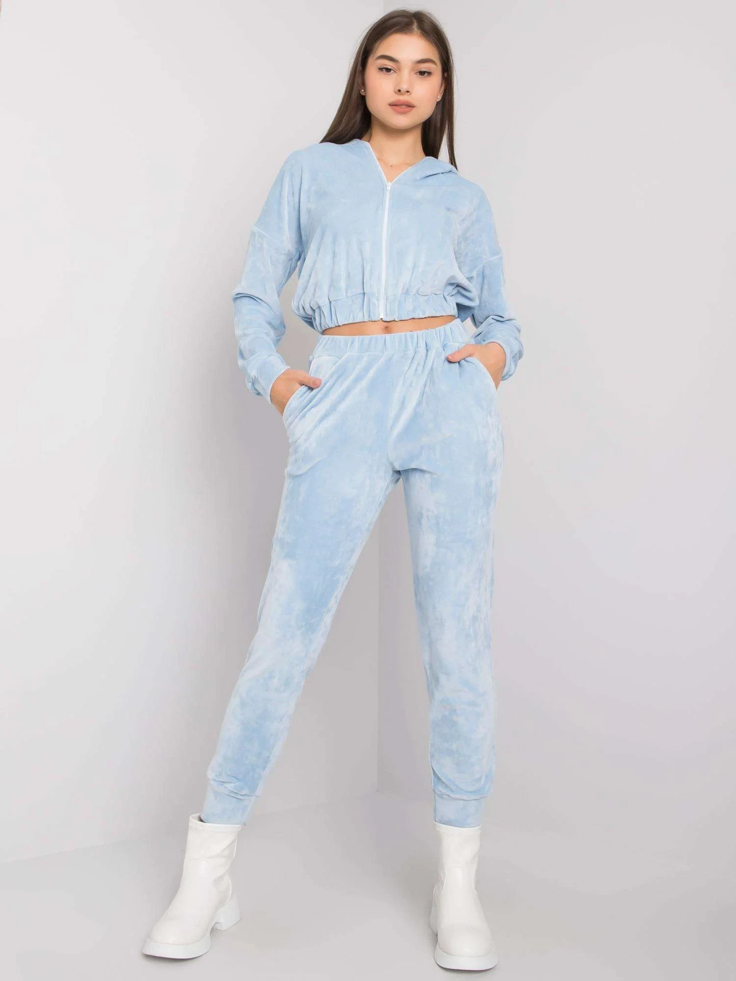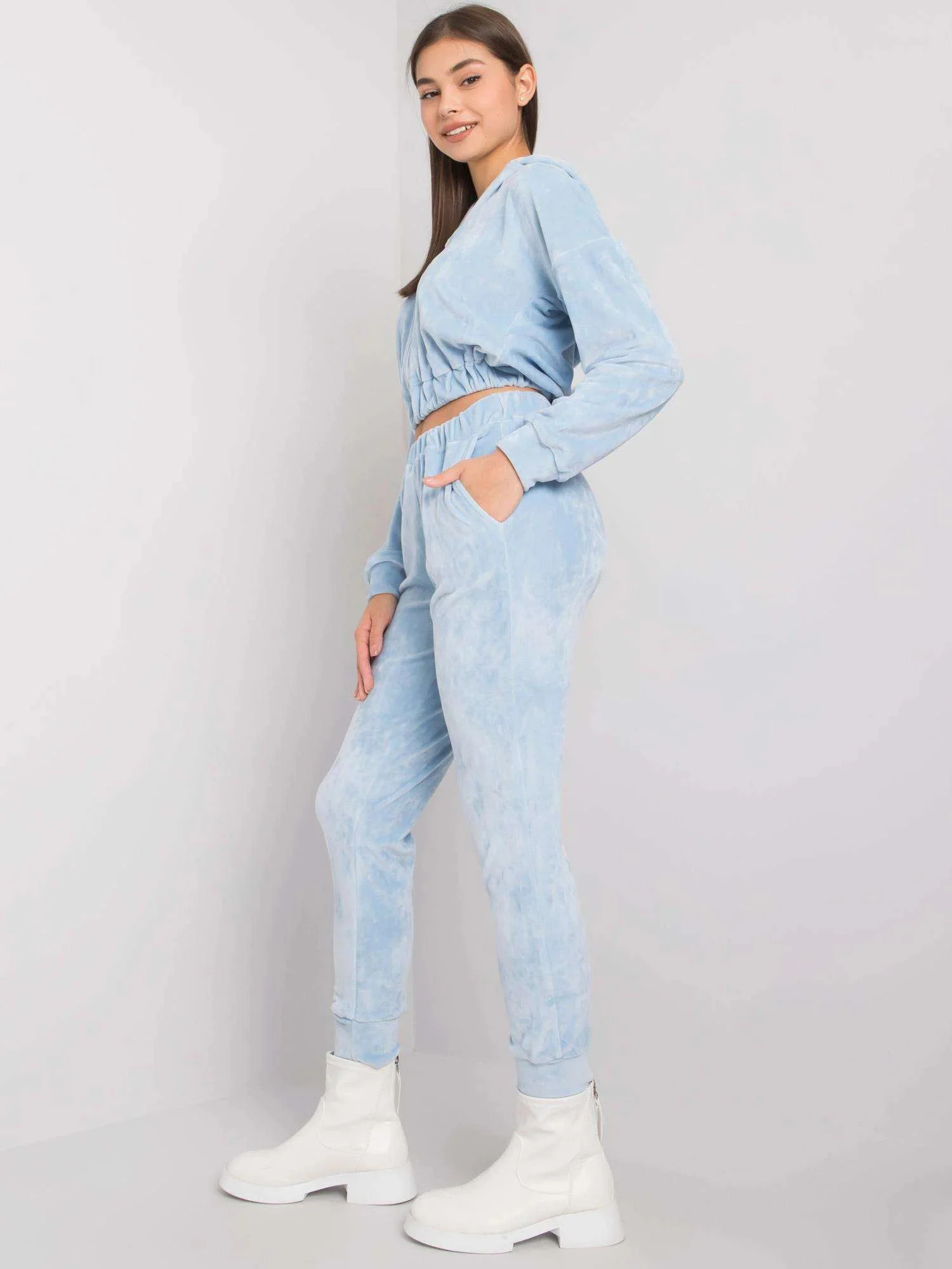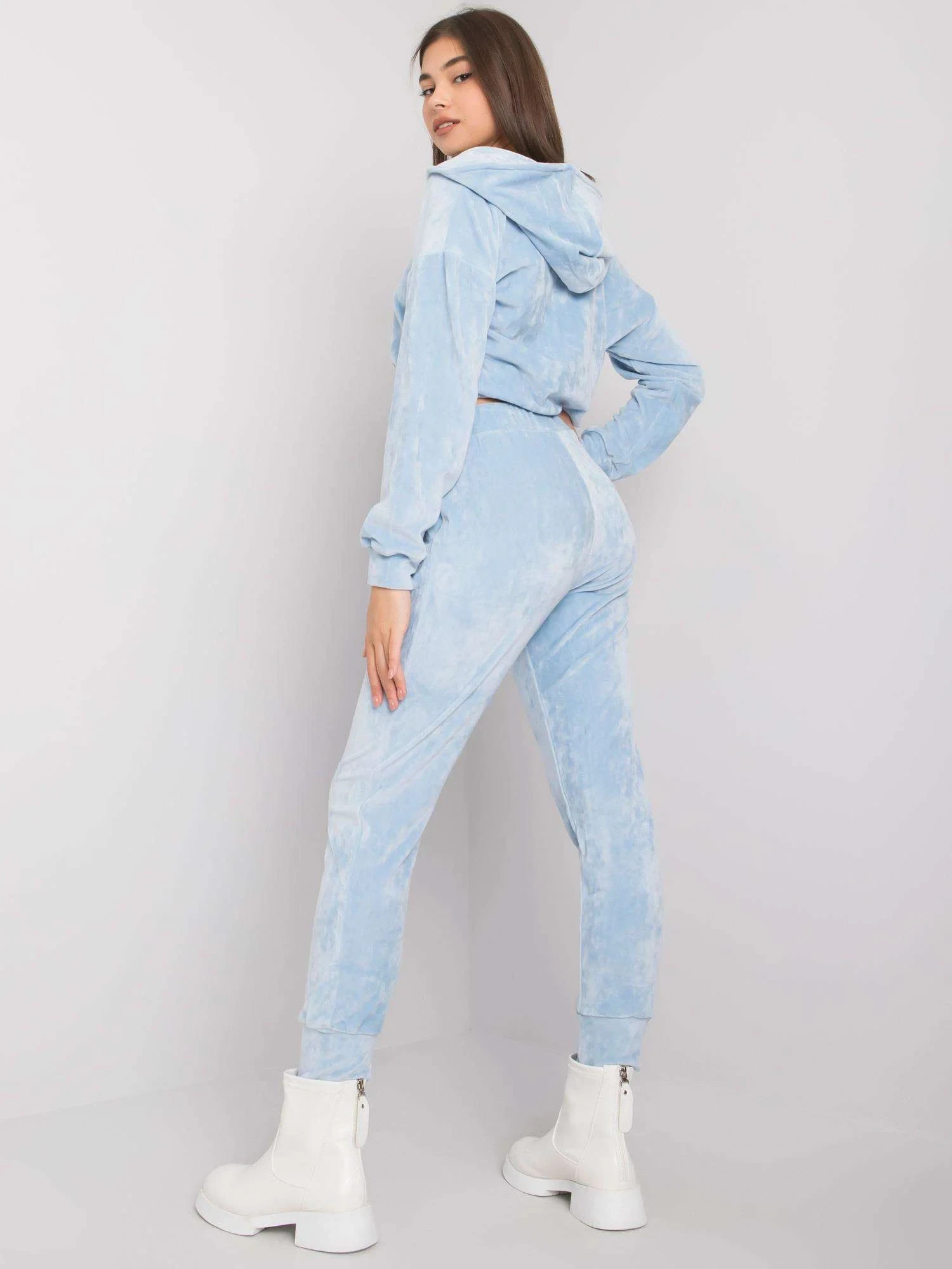 Modrá velurová souprava s kalhotami.