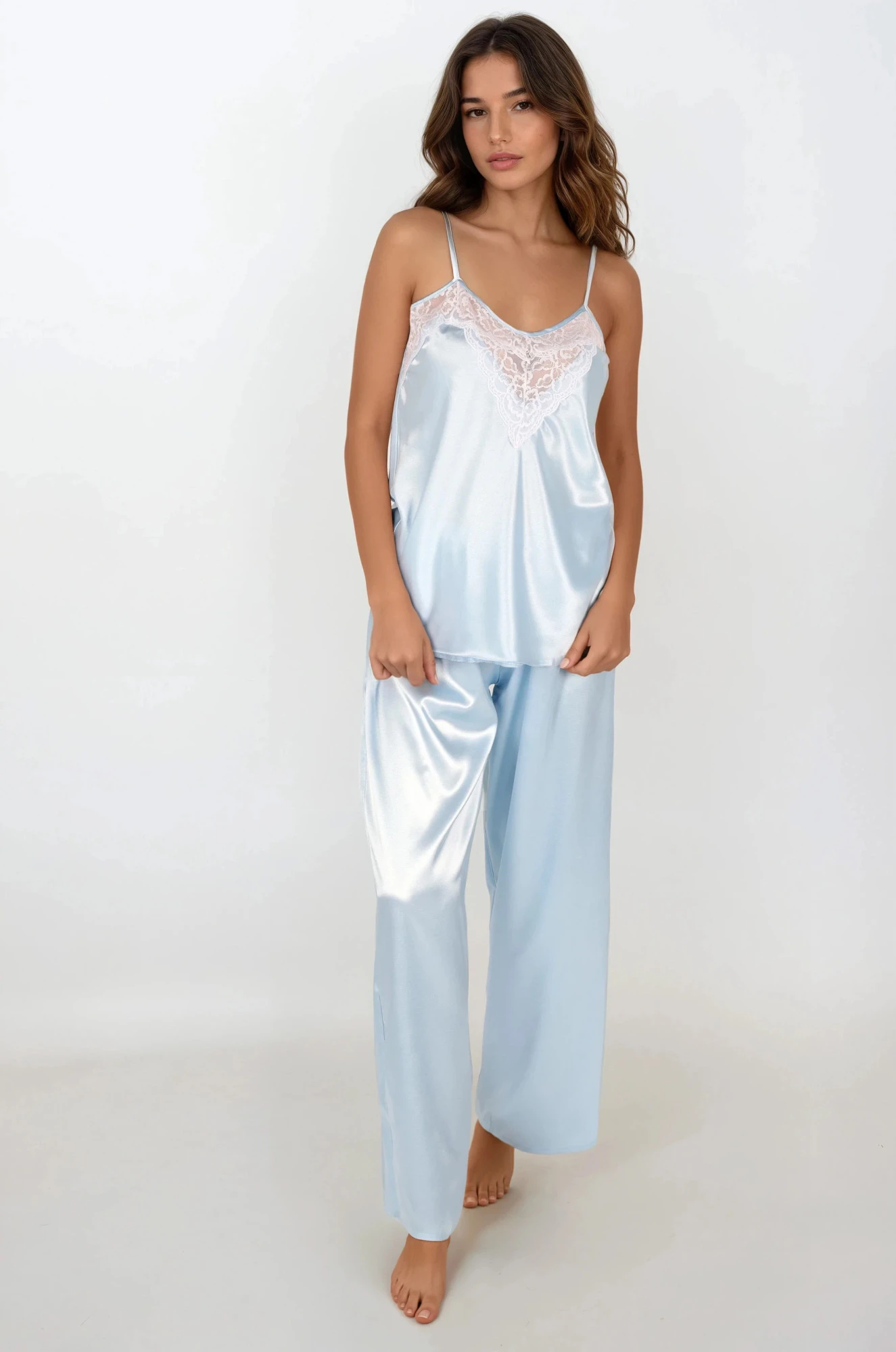 Kdo miluje pastelové barvy? Prohlédněte si nejnovější soupravu Melanie od značky DKaren, které dominuje pastelově modrá. Jedná se o okouzlující kombinaci sladké barvy s bílou krajkou a půvabem ušlechtilého, jemného saténu. Pohodlí a skvělý vzhled v jednom. Pokud máte chuť obléknout si halenku na ramínka v jemném, ženském provedení a pohodlné kalhoty - neváhejte a rezervujte si ji pro sebe. Složení: 100% polyester.