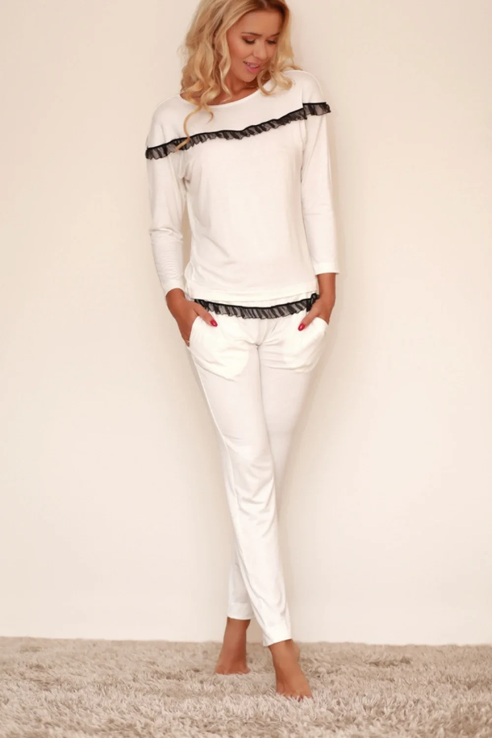 Mimořádně pohodlné a příjemné viskózové pyžamo zajistí dobrý spánek nejen během zimních nocí. Top je tričko s dlouhými rukávy a půvabným šifonovým volánem. Spodní část tvoří pohodlné kalhoty se dvěma kapsami a volánkem na gumičce. Souprava, ve které můžete úspěšně posedět u líné snídaně na terase. Návrh pro dámy, které si cení elegance a pohodlí během spánku.