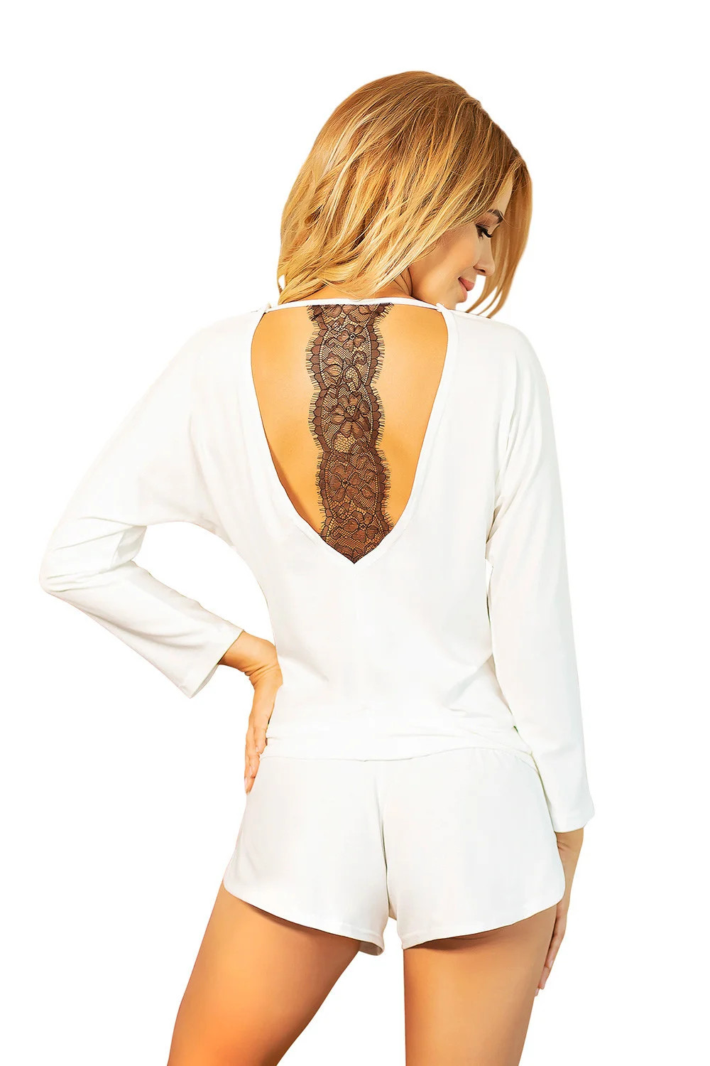 Krásná dvoudílná souprava z viskózy od společnosti Chalandri. Top je halenka s dlouhými rukávy a hladkým předním dílem, zatímco zadní díl je vytvořen kombinací krajky a viskózy. Sada obsahuje šortky s překrývajícími se boky nohavic. Pohodlná, ležérní souprava pro každodenní nošení i větší příležitosti.