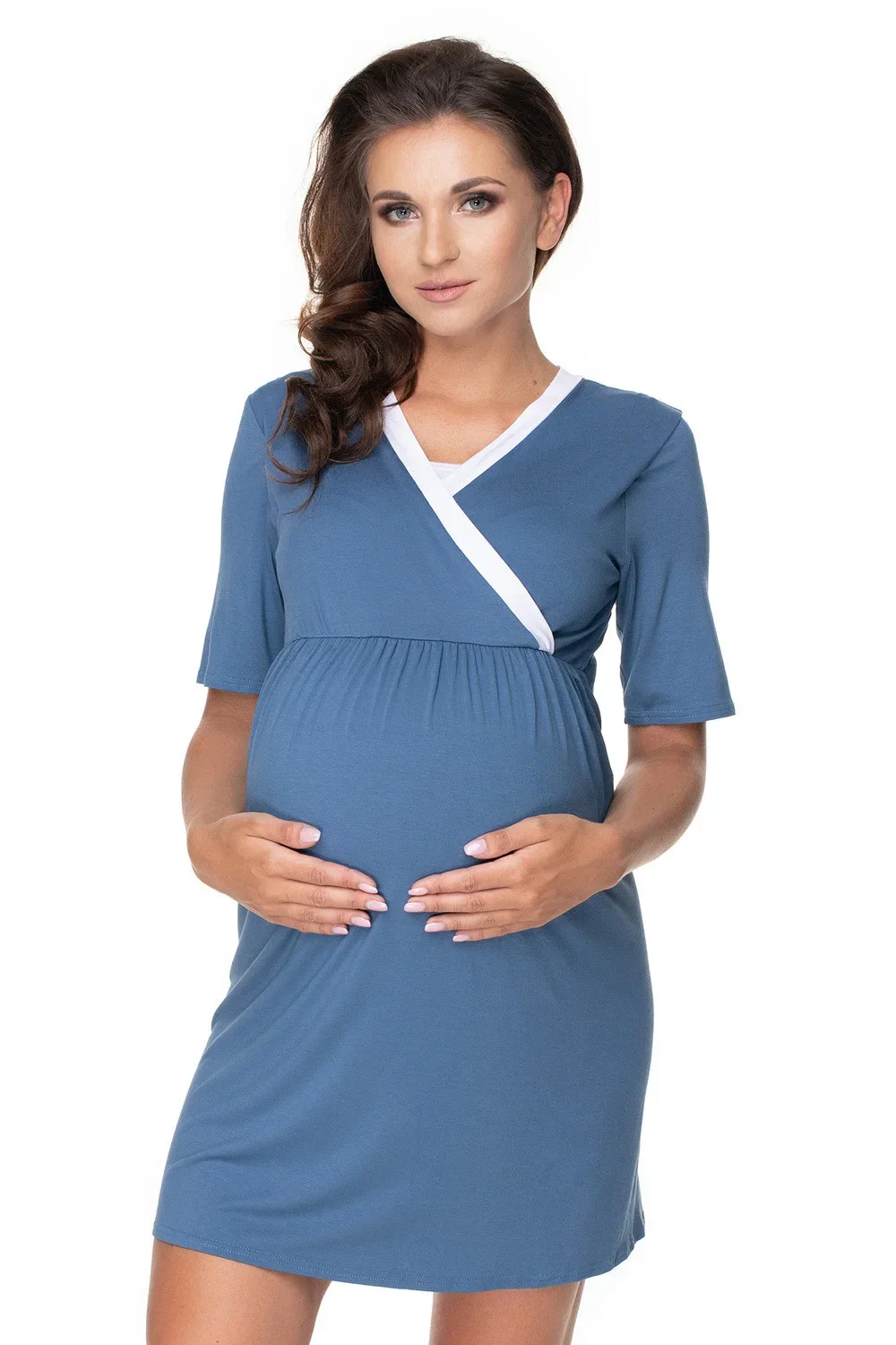 Těhotenská noční košile s kontrastním lemováním. Obálkový výstřih s kojící vložkou. Lze nosit i po těhotenství. Doplněno županem ve stejné barvě s páskem.