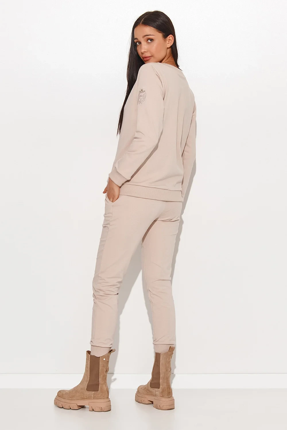 Klasická dámská souprava z tenkého bavlněného úpletu se skvěle hodí pro pracovní i každodenní styling. Sada je jednotná a jednoduchá. Jedinou ozdobou je krásná jemná nášivka s podpisem značky. Díky tomu je sada velmi univerzální. Halenka má kulatý výstřih a kalhoty mají praktické postranní kapsy. Oblečte si tento komplet s oblíbenými botami na podpatku a elegantní kabelkou a vyrazte do města. Dáváte přednost ležérnosti před elegancí? Pak si nazujte sportovní boty, vezměte batoh a oblečte si tuto krásnou teplákovou soupravu.