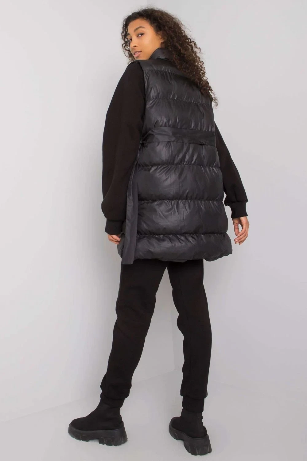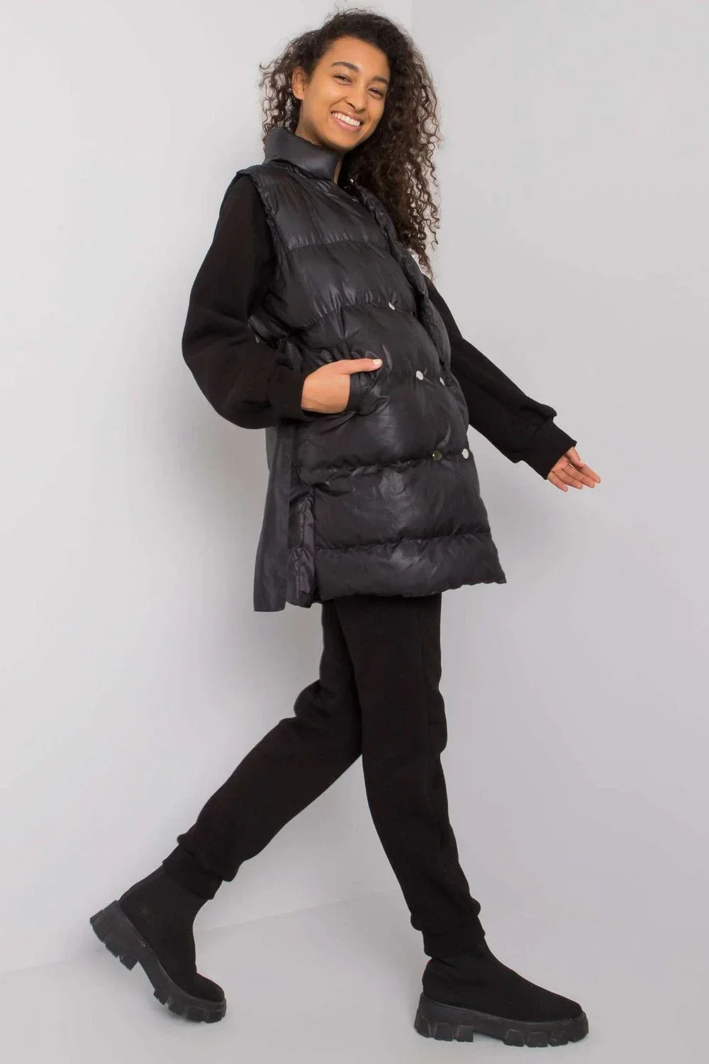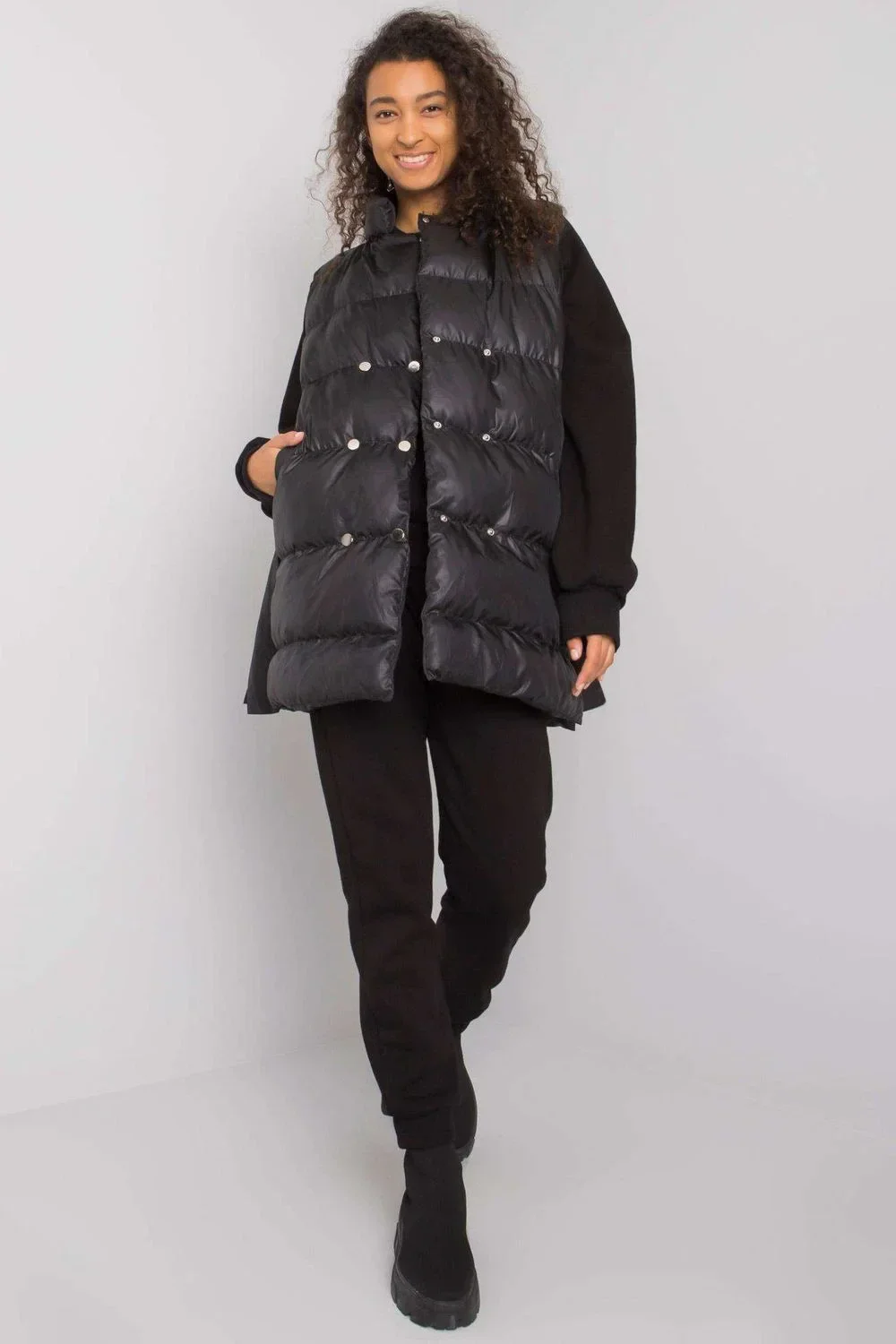 Zajímavá souprava sestávající z péřové vesty, mikiny a tepláků. Vesta se zapíná na patentky a na bocích jsou kapsy. Mikina rovného střihu s dlouhými rukávy. Tepláky se zavazováním v pase a nakládanými kapsami. Bavlna 70 %