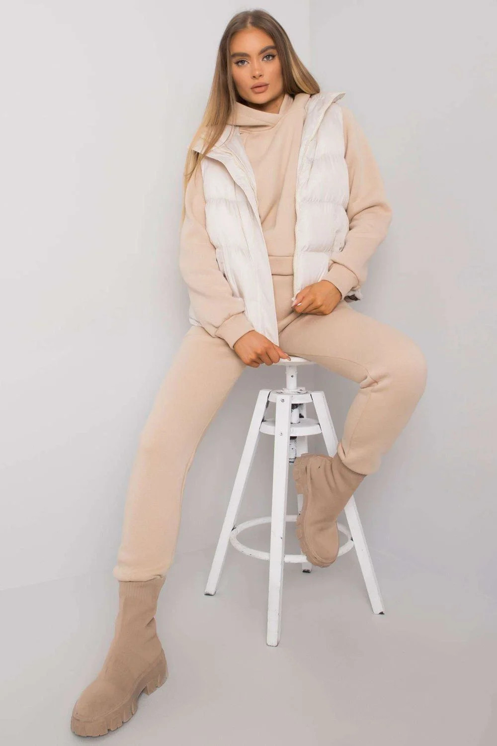 Sada sestávající z mikiny, tepláků a péřové vesty. Vesta na zip s kapsami. Mikina rovného střihu s dlouhými rukávy a kapucí. Tepláky s kapsami a zavazováním v pase. Bavlna 70 %