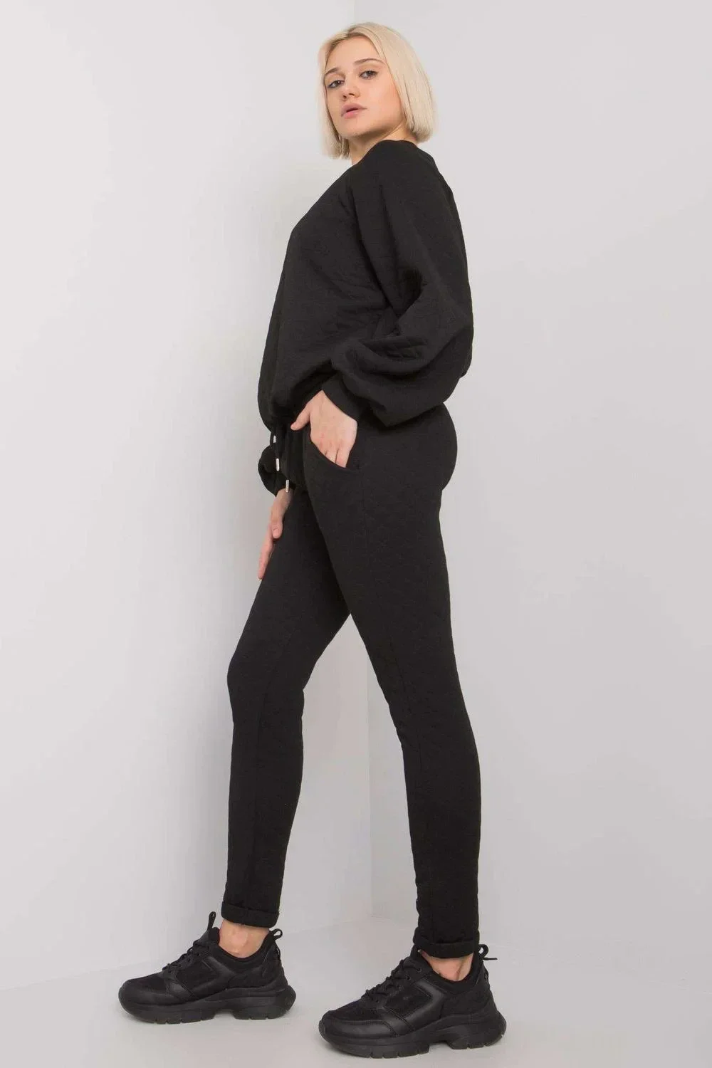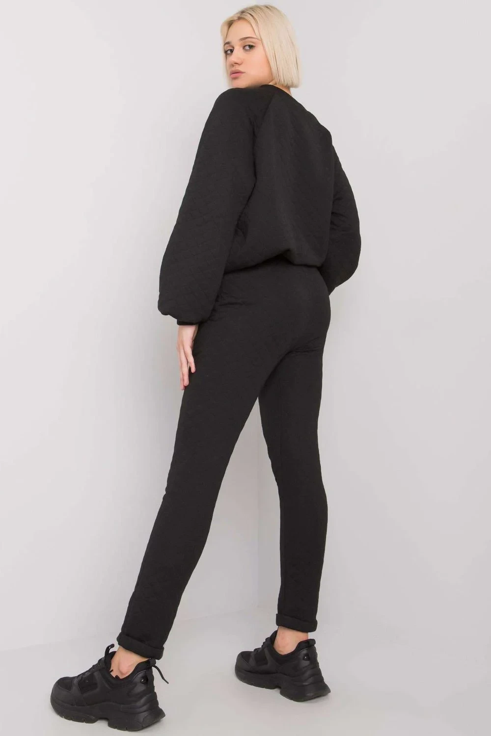 Prošívaná tepláková souprava sestávající z mikiny a kalhot. Mikina s dlouhým rukávem bez kapuce. Tepláky se zavazováním v pase a nakládanými kapsami.