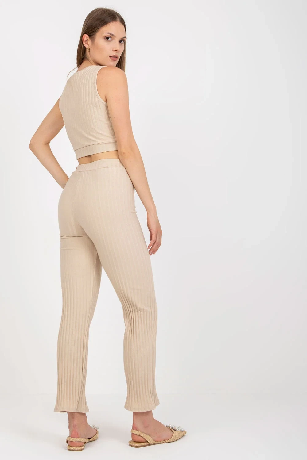 Souprava se skládá z topu a dlouhých kalhot. Krátký top s kulatým výstřihem. Dlouhé kalhoty s vysokým sedem a rovnými nohavicemi, v pase na gumu. Celek je vyroben ze široké žebrované tkaniny.