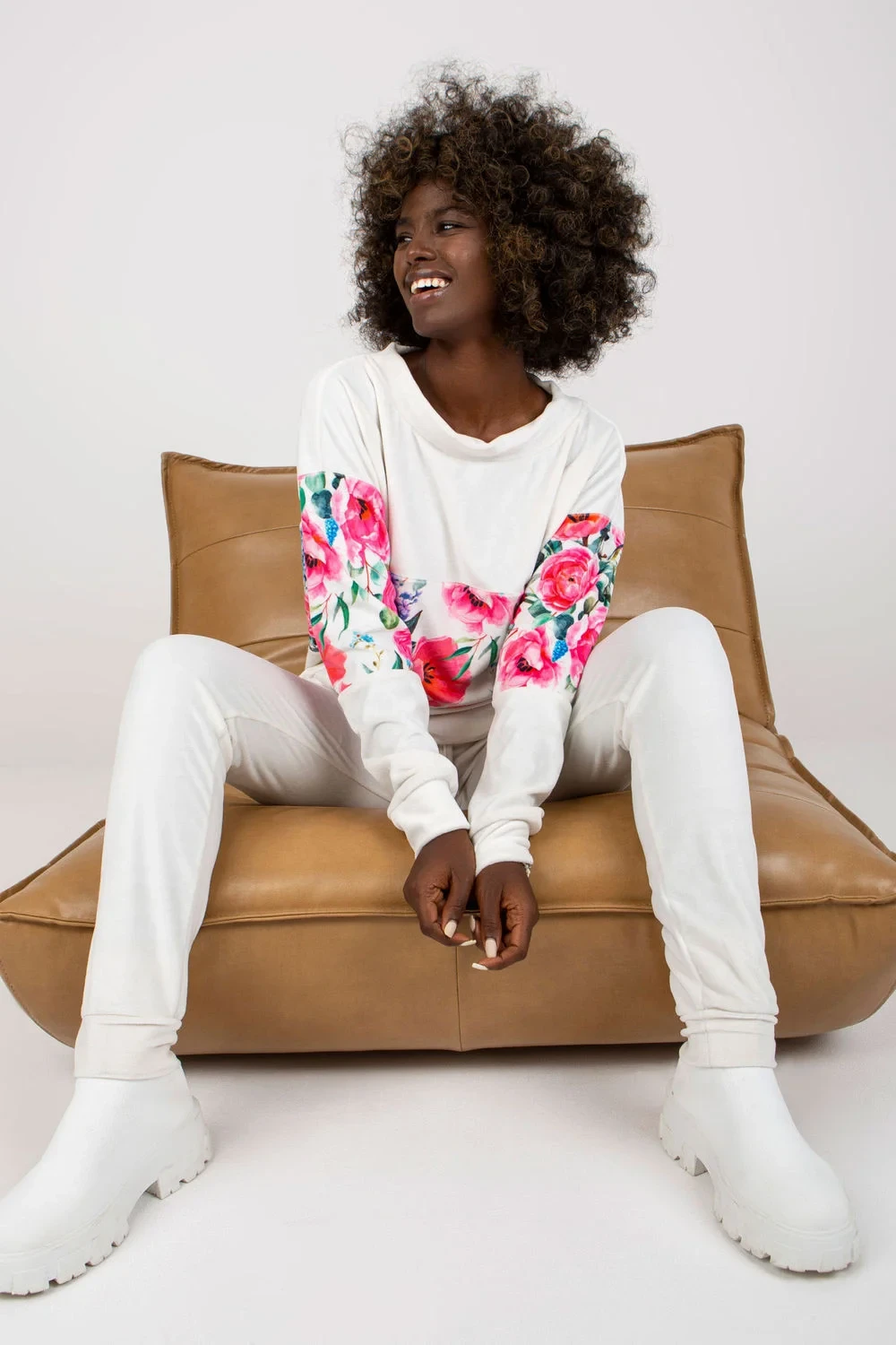 Souprava se skládá z mikiny a dlouhých kalhot. Halenka s dlouhými rukávy a kulatým výstřihem. Dlouhé kalhoty s vázáním a bočními kapsami.