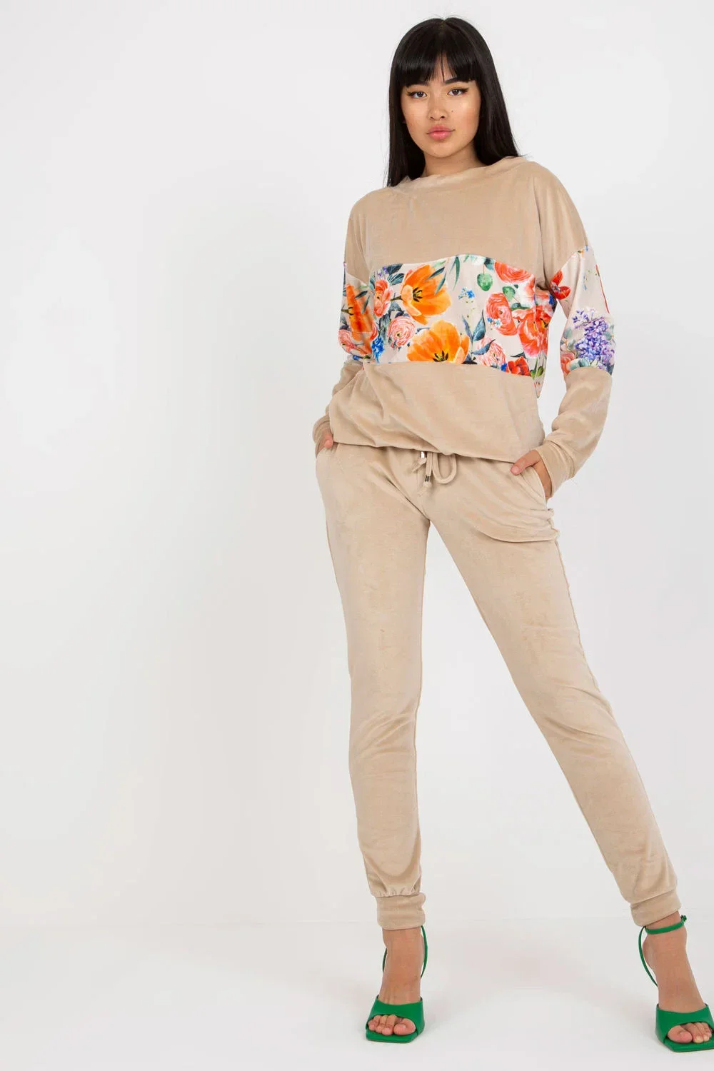 Souprava se skládá z mikiny a dlouhých kalhot. Halenka s dlouhými rukávy a kulatým výstřihem. Dlouhé kalhoty s vázáním a bočními kapsami.