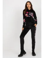 Velurová souprava sestávající z mikiny a dlouhých kalhot. Halenka s dlouhými rukávy a kapucí. Dlouhé kalhoty se zavazováním v pase a nakládanými kapsami. Sada s dekorativními květinovými vložkami.