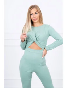 Tepláková souprava sestávající z mikiny a kalhot. Mikina s dlouhými rukávy a kapucí. Dlouhé kalhoty s vysokým pasem, elastickým pasem a vázáním, s kapsami na bocích.