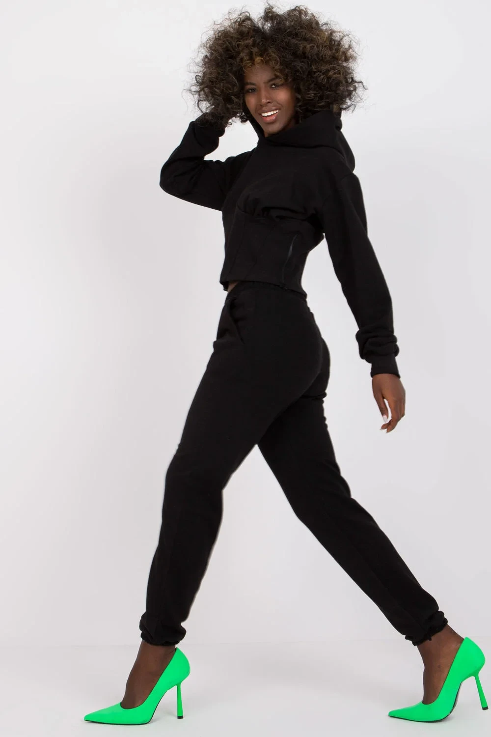 Tepláková souprava sestávající z mikiny a dlouhých kalhot. Mikina s dlouhými rukávy, prošívání na přední straně, korzetová vsadka. Mikina s kapucí a zipem na boku. Teplákové kalhoty s elastickým pasem, boční kapsy s jezdci.