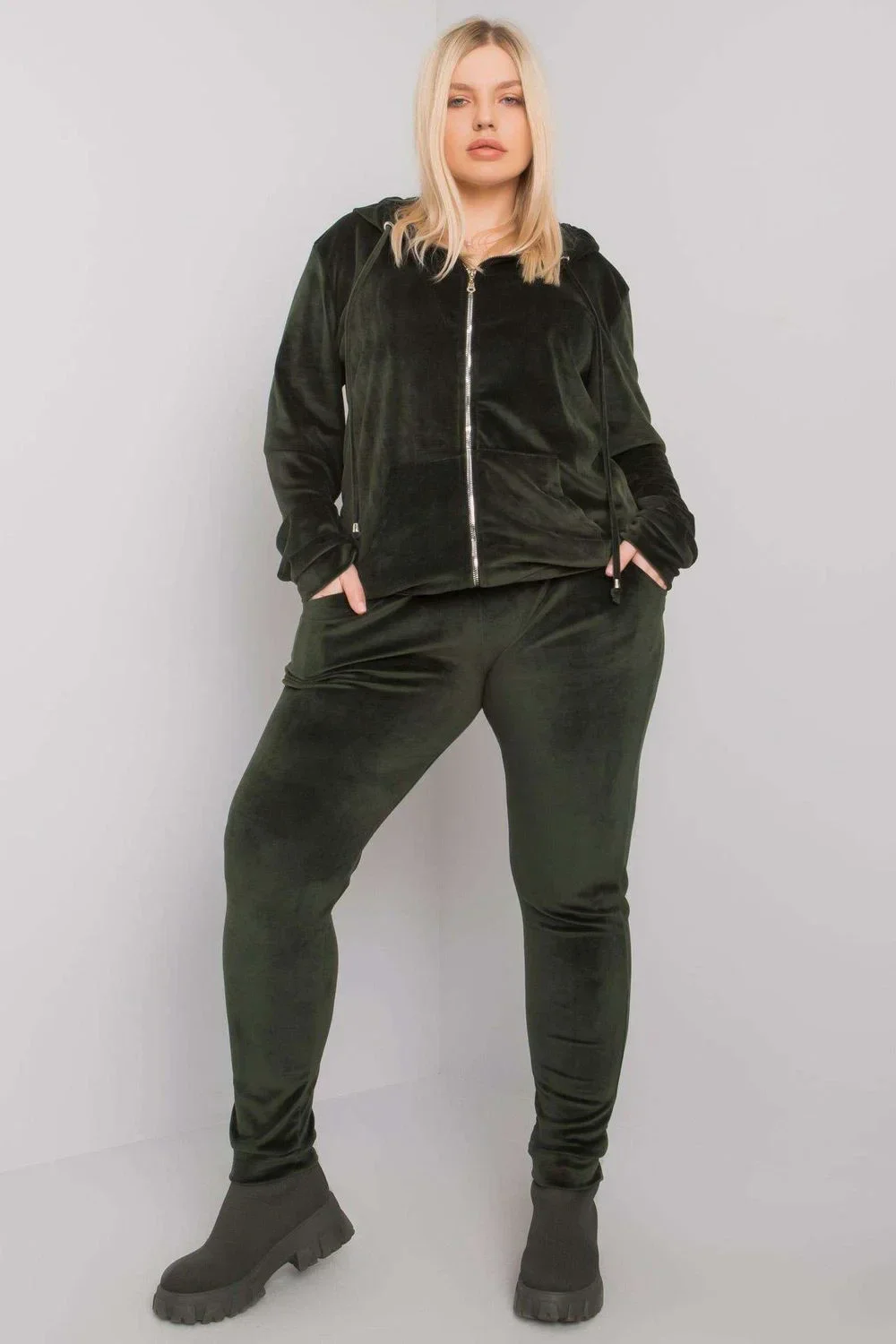 Velurová souprava sestávající z mikiny a dlouhých kalhot. Mikina s dlouhými rukávy a kapucí, zapínání na zip, kapsy na přední straně. Dlouhé kalhoty se šňůrkou v pase a kapsami na bocích.