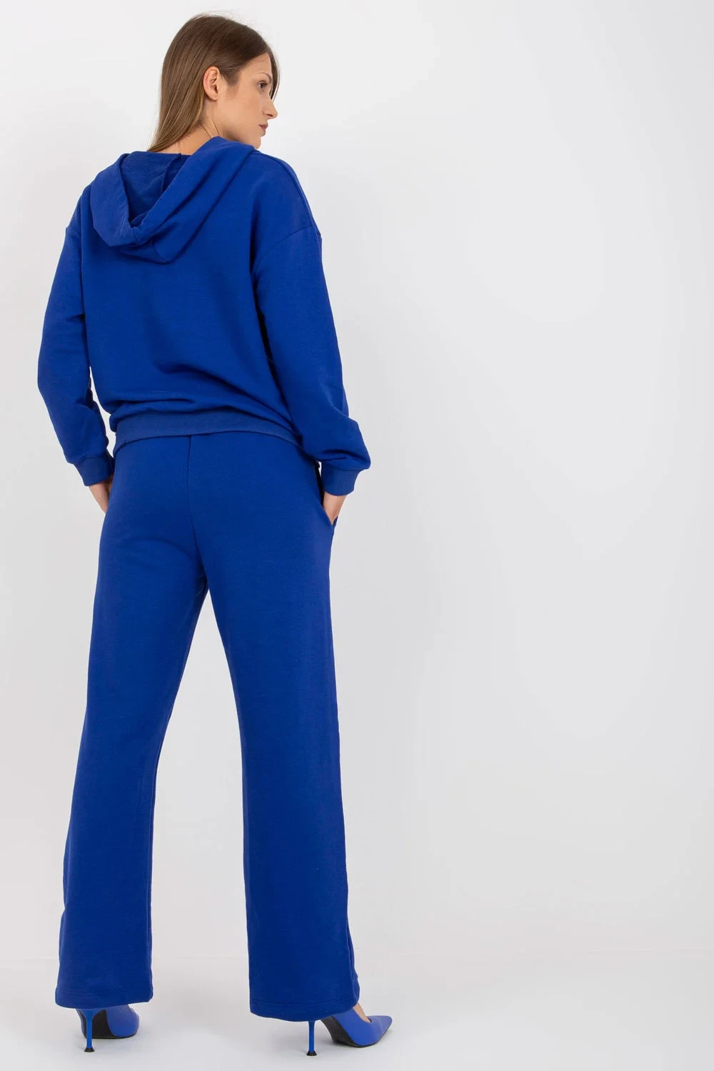 Dámská tepláková souprava sestávající z mikiny a dlouhých kalhot. Mikina s dlouhými rukávy a kapucí. Dlouhé kalhoty s elastickým pasem a kapsami na bocích.