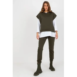 Tepláková souprava sestávající z halenky, mikiny a kalhot. Halenka s 3/4 rukávy a kulatým výstřihem. Halenka s krátkými rukávy a kapucí. Dlouhé kalhoty se zavazováním v pase a nakládanými kapsami.