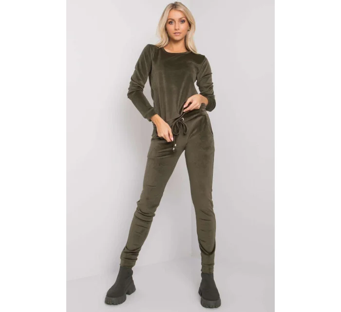 Velurová souprava sestávající z halenky a kalhot. Halenka s dlouhými rukávy a kulatým výstřihem. Dlouhé kalhoty se zavazováním v pase a nakládanými kapsami.