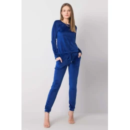 Velurová souprava sestávající z halenky a kalhot. Halenka s dlouhými rukávy a kulatým výstřihem. Dlouhé kalhoty se zavazováním v pase a nakládanými kapsami.