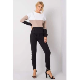 Tepláková souprava sestávající z mikiny a kalhot. Halenka s dlouhými rukávy a kulatým výstřihem. Mikina z látky ve třech barvách. Dlouhé kalhoty s pružným pasem, stahovací šňůrkou v pase a nakládanými kapsami.