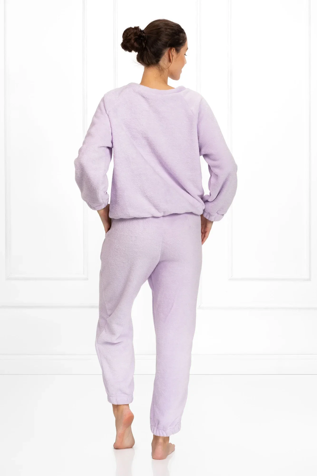 Vivi je hřejivá a měkká dámská tepláková souprava v chladné barvě. Pyžamo obsahuje vršek s dlouhými rukávy a dlouhé kalhoty. Spodní část mikiny, rukávy a nohavice jsou zakončeny lemem. Kalhoty mají elastický pas a kapsy na bocích. Perfektní domácí oblečení. Celek je volný a pohodlný. Polský výrobek. Vysoká kvalita.