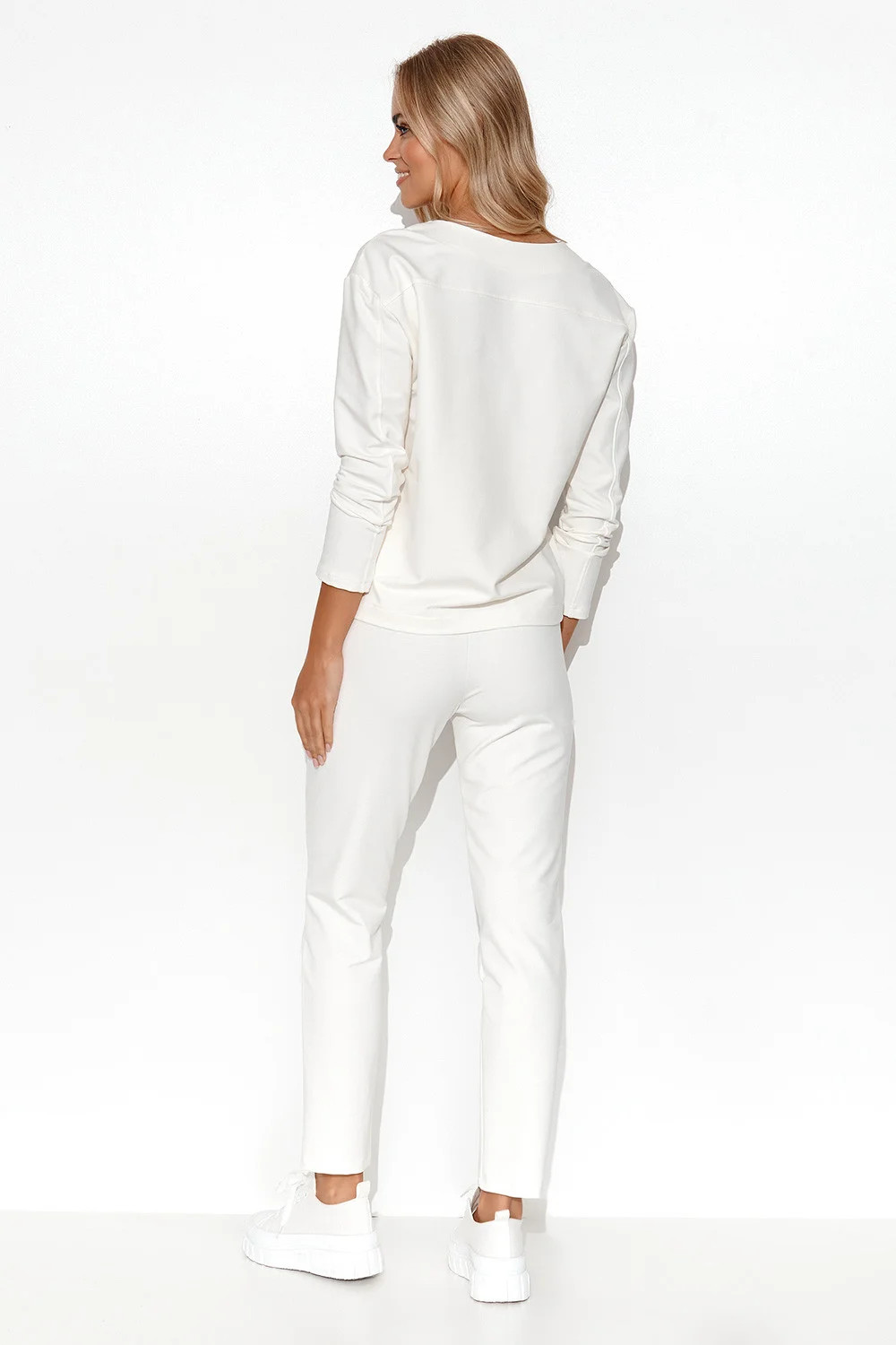 Elegantní dámská tepláková souprava. Minimalistická halenka má hluboký výstřih do V, dlouhé rukávy a zajímavé modelující prošívání. Na přední straně je našita jemná nášivka s písmenem M. Dámská halenka vypadá na siluetě mimořádně elegantně. Kalhoty s rovnými nohavicemi ji skvěle doplňují. I ony jsou opatřeny prošíváním, které dodává soupravě business chic nádech. Na bocích jsou přístupné nakládané kapsy. V pase je do kalhot všita silná elastická šňůrka. Díky tomu kalhoty ještě lépe sedí na ženské postavě.