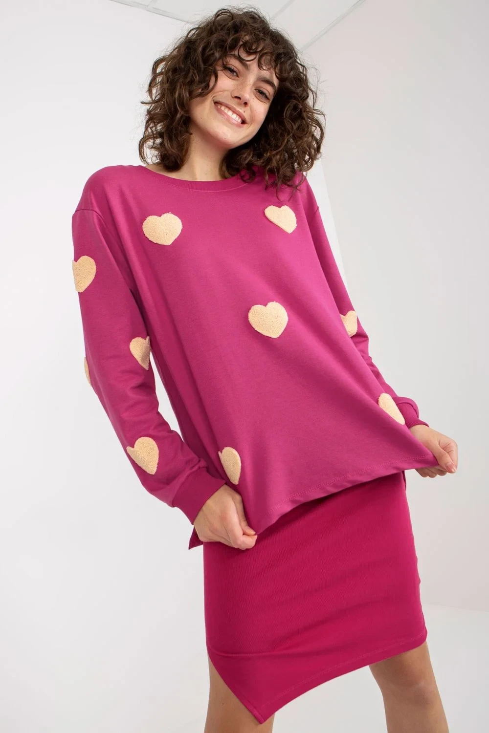Ležérní dámská souprava sestávající z halenky a šatů. Volná halenka s dlouhými rukávy a kulatým výstřihem. Šaty vypasovaného střihu s ramínky z žebrované látky.
