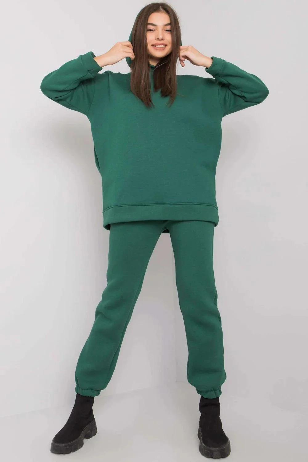 Tepláková souprava sestávající z mikiny a kalhot. Mikina s dlouhými rukávy, kapucí a kapsami. Dlouhé kalhoty s elastickým pasem a kapsami.