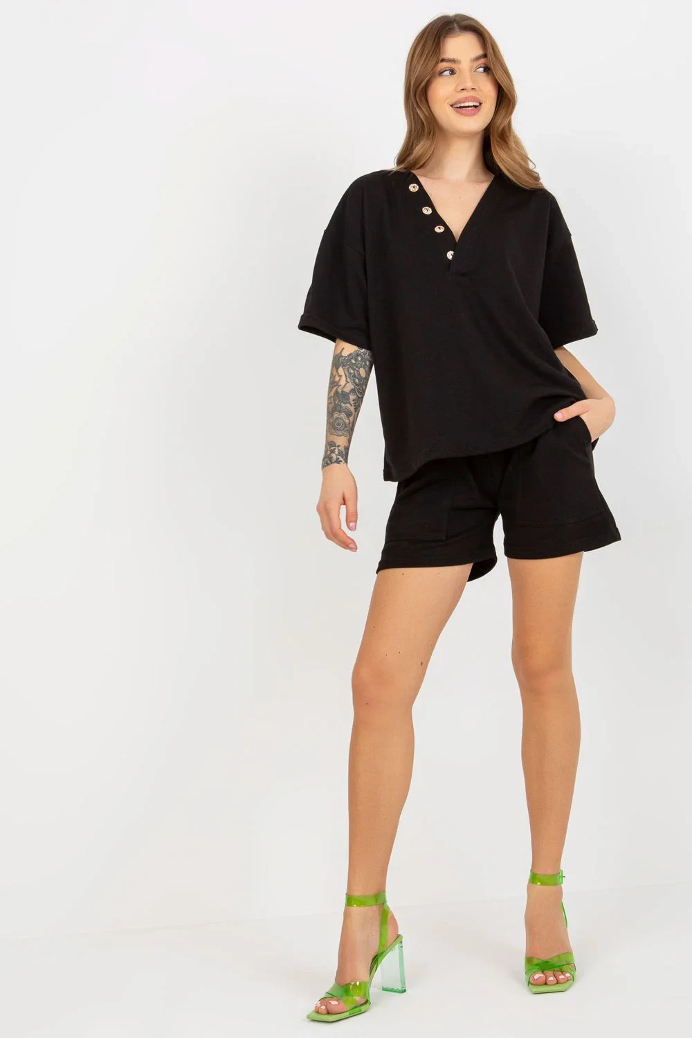 Tepláková souprava sestávající z halenky a šortek. Halenka s krátkými rukávy a výstřihem do V. Šortky se zavazováním v pase a kapsami.