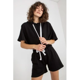 Tepláková souprava sestávající z halenky a šortek. Blůza s krátkými širokými rukávy, kapucí a klokaní kapsou. Šortky se zavazováním v pase a kapsami.
