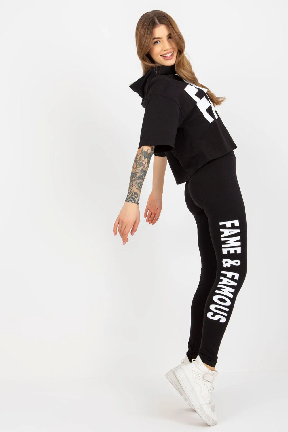 Tepláková souprava sestávající z mikiny a legín. Volná mikina s krátkými rukávy a kapucí. Dlouhé legíny se širokým elastickým pasem. Souprava s ozdobnými nápisy.