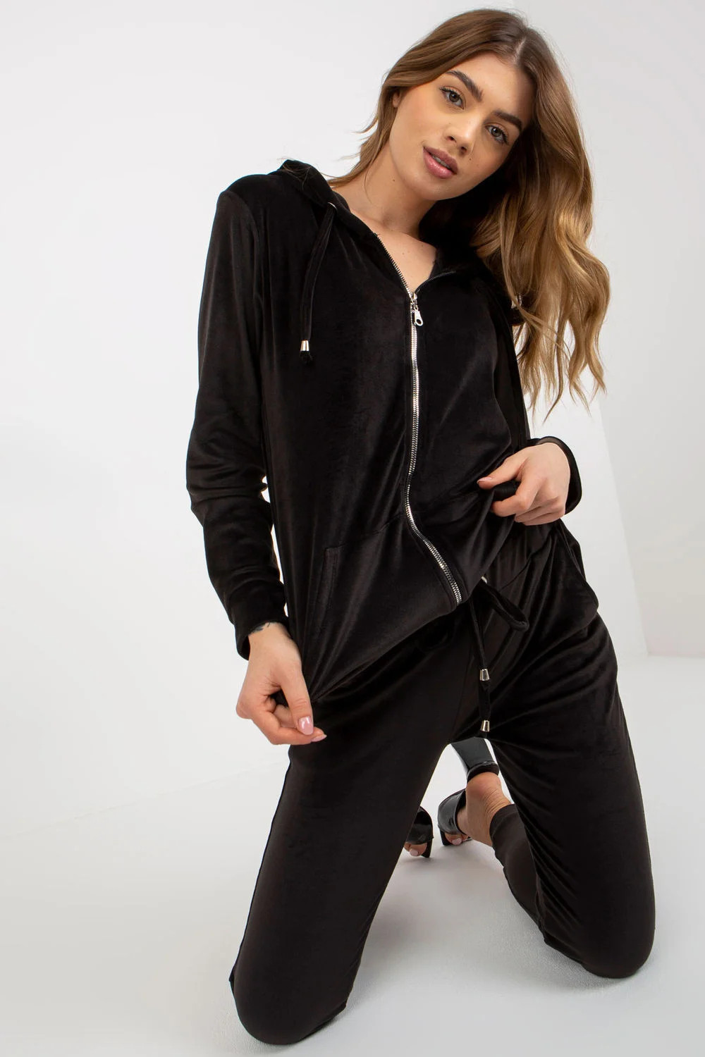 Velurová souprava sestávající z mikiny a dlouhých kalhot. Mikina s dlouhými rukávy a kapucí, zapínání na zip. Na přední straně jsou kapsy na druky. Dlouhé kalhoty se stahovací šňůrkou v pase a nakládanými kapsami na bocích.