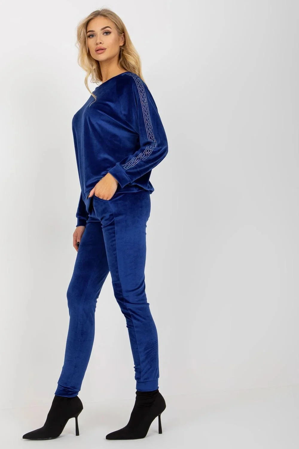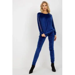 Velurový komplet sestávající z halenky a dlouhých kalhot. Halenka s dlouhými rukávy a kulatým výstřihem. Dlouhé kalhoty se šňůrkou v pase a kapsami na bocích. Rukávy zdobené kamínkovým vzorem.