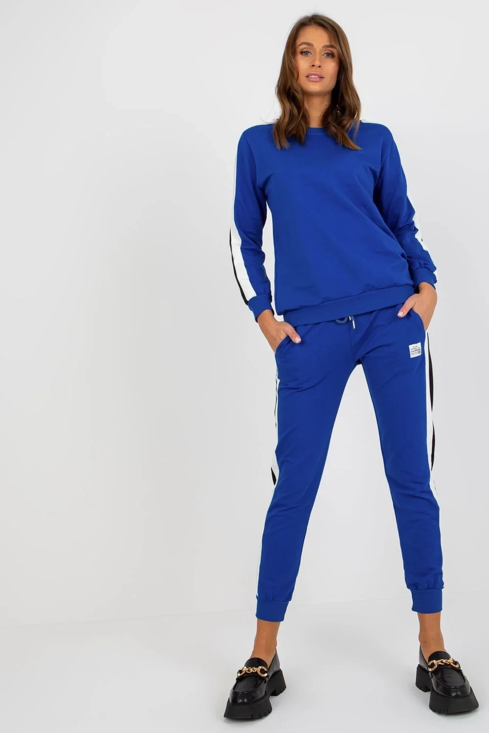 Tepláková souprava sestávající z mikiny a kalhot. Halenka s dlouhými rukávy a kulatým výstřihem. Dlouhé kalhoty se zavazováním v pase a nakládanými kapsami. Souprava s ozdobným dvoubarevným lemováním.