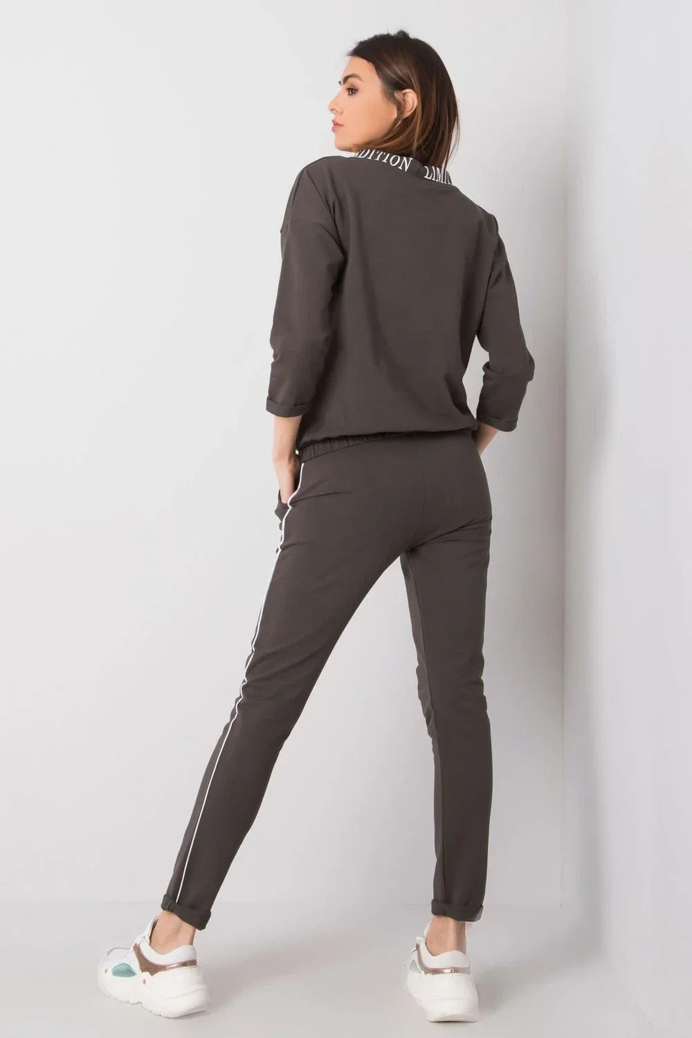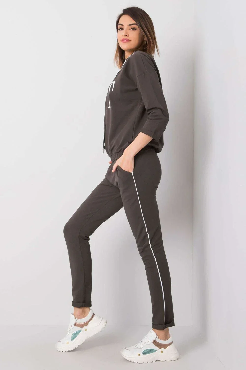 Dámská tepláková souprava sestávající z mikiny a kalhot. Halenka s 3/4 rukávy a malým stojáčkem. Dlouhé kalhoty se zavazováním v pase a nakládanými kapsami. Ozdobný nápis na přední straně a na límci.