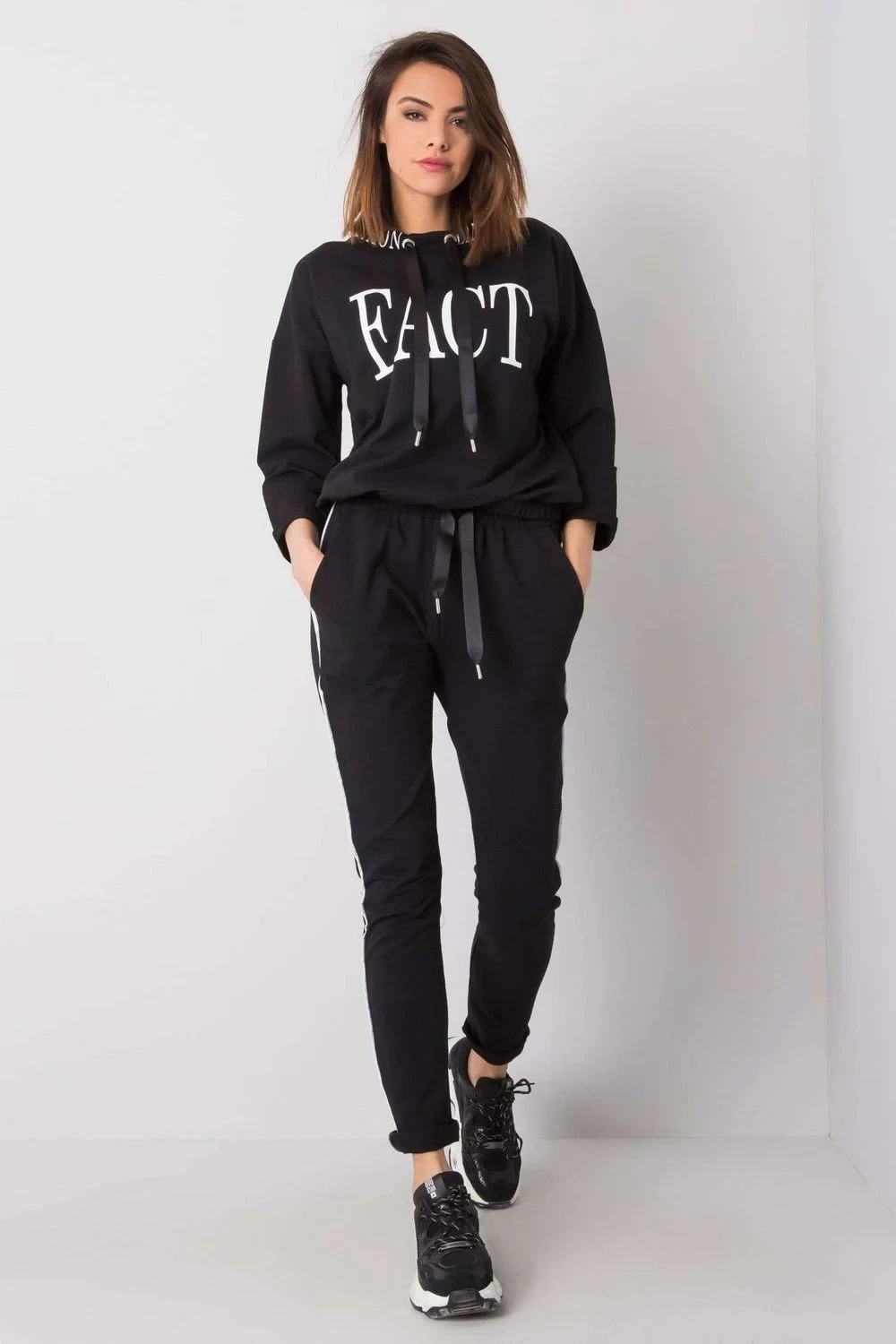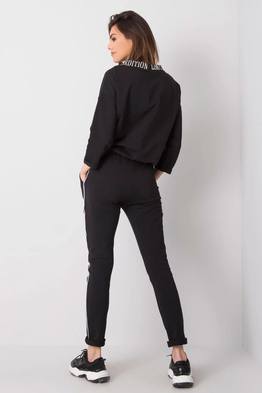 Dámská tepláková souprava sestávající z mikiny a kalhot. Halenka s 3/4 rukávy a malým stojáčkem. Dlouhé kalhoty se zavazováním v pase a nakládanými kapsami. Ozdobný nápis na přední straně a na límci.