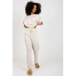 Letní souprava sestávající z halenky a kalhot. Halenka s krátkými rukávy a kulatým výstřihem. Dlouhé kalhoty se zavazováním v pase a nakládanými kapsami.